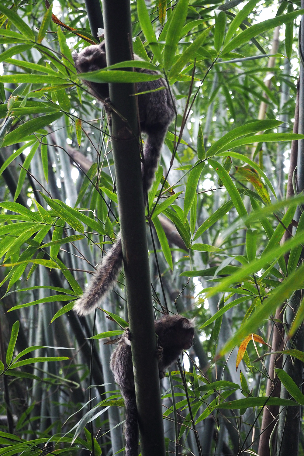 Mein absolutes Highlight auf der Insel war allerdings ein Spaziergang am späten Nachmittag durch den Dschungel an einem der meist frequentiertesten Pfade zwischen der Praia Pouso und der Vila do Abraão. Da das Wetter an diesem Tag aber eher zu wünschen übrig ließ, waren wir fast die einzigen Wanderer auf dieser Strecke durch den Wald. Die Sonne geht im Winter schon um 17:30 unter und wir versuchten noch im Sonnenlicht nach Hause zu kommen. Zu allererst entdeckten wir eine Gruppe von Eichkätzchen, bei denen wir ganz schön verwundert waren, dass es die hier überhaupt gibt. Und ein paar Meter weiter erstarrte ich vor Schreck vor einem ein Meter großen schwarzen Tier, dass sich am Baumstamm festkrallte und mich anstarrte. Es war genau auf meiner Augenhöhe, ich machte panisch ein paar Schritte zurück. Zuerst dachte ich naiv an einen Jaguar (eher einen Babyjaguar), doch dann bemerkte ich dass es sich um einen Brüllaffen handelte. Ich war mir zwar um ihre Existenz schon seit dem letzten Besuch bewusst, denn immerhin hört man konstant ihr Gebrüll, trotzdem hatte ich bis dato nie einen gesehen und wunderte mich immer wie sie wohl aussehen würden. Als ich Alex leise auf meine Entdeckung aufmerksam machte erspähte ich über uns eine ganze Brüllaffenfamilie. Sie hatten sogar ein Baby dabei, das sich um den Bauch der Mutter klammerte. Der Affe vor meinen Augen machte sich langsam aus dem Staub, er fand das Treffen wohl genauso unheimlich wie ich. Und als wir ein paar Schritte weiter machten entdeckten wir das nächste mysteriöse Tier. Es war fast so groß wie die Affen zuvor, allerdings braun und viel dicker. Es bewegte sich nur langsam und gemächlich den Baum hinauf. Wir konnten unseren Augen gar nicht trauen, dass wir so viele brasilianische Dschungeltiere auf einen Haufen erblicken durften. Nachdem wir am Abend Google befragt hatten, stellte sich heraus, dass das zweite Tier ein junges Stacheltier war. Nach diesem Erlebnis gingen wir nur noch extrem behutsam und langsam durch die Wälder und unsere Blicke blieben immer wieder in den hohen Bäumen hängen, in der Hoffung wieder eines dieser Tiere erblicken zu dürfen. Aber außer den Weißbüschelaffen kam uns keines mehr unter.