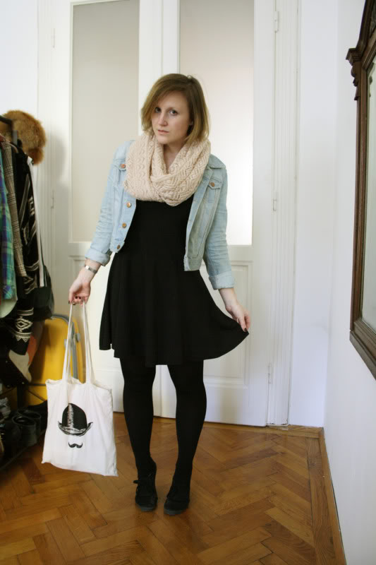 Schal, Jeansjacke, Kleid, Strumpfhose und Plimsoles von H&M, noname Tasche, Brille von Mango