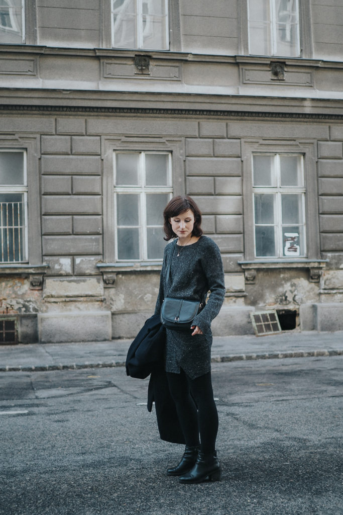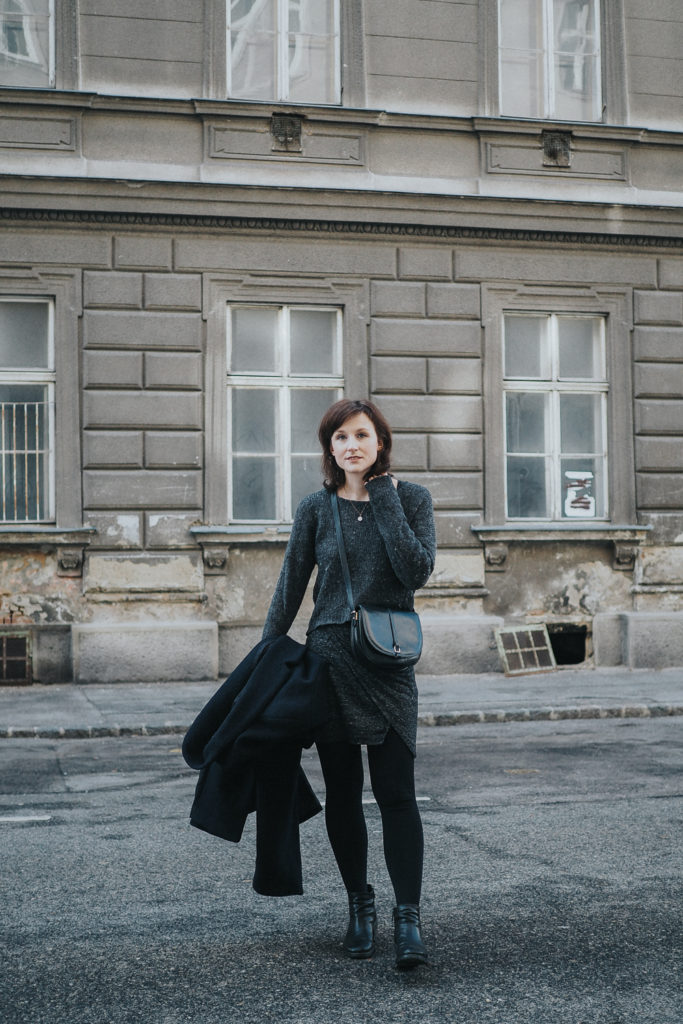 Dennoch, nehmt meine Worte nicht zu ernst. Natürlich tage ich keine abgelatschten Converse mehr und auch keine zerrissenen Jeans. Aber die meiste meiner Kleidungsstücke sind mittlerweile mehr als 7 Jahre alt. Sie gefallen mir noch immer – das ist das wichtigste daran – und natürlich erfüllen sie vor allem ihren Zweck. Ein Unterhemd, das Löcher hat hält trotzdem die Niere warm und bekommt garantiert niemand zu Gesicht, außer ich selbst (und eventuell mein Freund). Generell sind Shirts mit Löchern nicht immer gleich ein Fall für die Müllhalde. Es kommt eben drauf an wo das Loch anzufinden ist. Ist es vielleicht am unteren Saum, kann man das Shirt noch unkompliziert in die Hose stricken. Oder seitlich? Dann einfach einen Weste drüber. Im Winter kann man ohnehin alles unter einen Pullover anziehen, ganz egal wie hässlich oder kaputt, weil wie oft ziehen wir den Pullover in der Arbeit oder beim Treffen mit Freunden wirklich aus? Dieses Outfit zeigt es ganz perfekt. Schuhe, die ich mir vor sieben Jahren gekauft habe. Der Reißverschluss schon kaputt, die Absätze schon abgewetzt. Jedes Jahr sage ich mir: „Aber nächsten Winter gibt’s neue Stiefel“. Und immer wieder denk ich mir „Ach, dieses Jahr machen sie es schon noch“. Die Strumpfhose ist mindestens 10 Jahre alt. Löcher bei den Zehen werden mit Nagellack geflickt. Das Kleid auch bestimmt schon acht Jahre alt. Im Winter noch immer eines meiner liebsten Kleidungsstücke, dieses kommt immerhin auch ohne Loch aus. Der Pullover von einer Kleidertauschparty, keine Ahnung wie viele Jahre schon am Buckel – aber ich liebe ihn heiß. Den Mantel über Kleiderkreisel erstanden, wahrscheinlich nicht ganz so alt, aber bestimmt lange noch in meinem Besitz. Das einzig neue: eine Halskette, die ich mir in einem kleinen Laden in Malta gekauft habe von einer lokalen Schmuckdesignerin.
