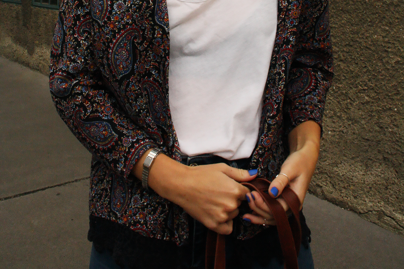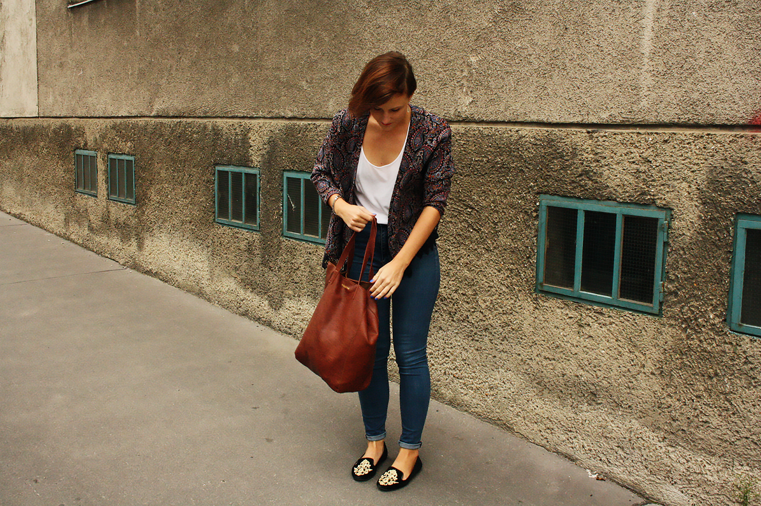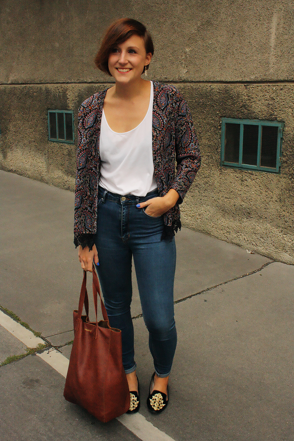 Highwaist Jeans und Loafers von Zara // Tasche von Pull and Bear // Tanktop von Cheap Monday // Weste von Bershka // Schmuck von H&M