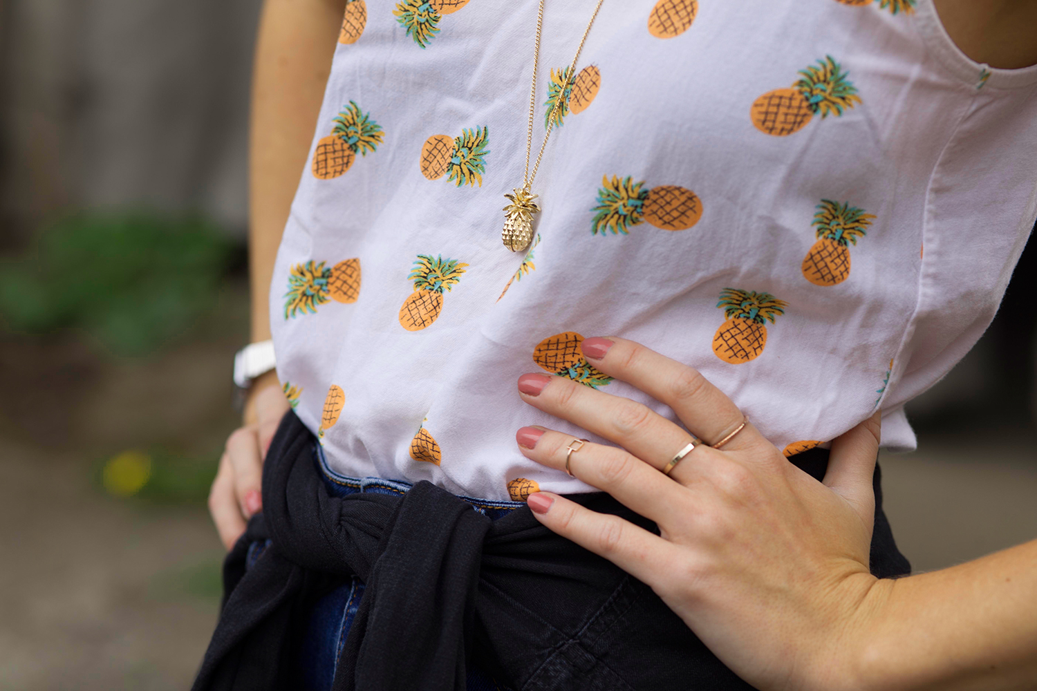 Die Ananas hat sich im letzten Jahr schon zu einem ziemlichen Hype gemausert und ich bin voll eingestiegen. Neben Ananas Shorts und Ananas Ohrringen haben sich mittlerweile auch Ananas Shirt und Ananas Kette zu meiner Sammlung gesellt. Ursprünglich wäre mein kleines Boot Tattoo ja auch fast eine kleine Ananas geworden, da mein Freund allerdings schon eine Ananas tätowiert hatte und nicht lust auf eine zweite hatte, entschieden wir uns für das Boot. Ananas macht mir einfach Laune. Ich denke an frische Ananas Smoothies mit Minze, die ich immer in Brasilien getrunken habe und ich denke einfach an Sommer. Ich muss allerdings zugeben, dass ich eigentlich auf Ananas etwas allergisch reagiere und nach einer Spalte schon einen ganz flaumigen Gaumen habe, noch dazu kaufe ich mir eher selten eine Ananas, obwohl sie mir soooo gut schmeckt, da sie im Supermarkt nur relativ selten mit einem Fairtrade Siegel erscheint. San Lucar, nein danke! So viel zu meinem Ananaskonsum. Auch wenn das Shirt wahrscheinlich nicht mit fairen Mitteln hergestellt wurde, ist es meine absolute Sommerliebe. Irgendwie fällt es mir bei Nahrungsmittel leichter aufs Herkunftssigel zu achten, als bei Kleidung. Das liegt wahrscheinlich an der relativ geringen Preisspanne und natürlich dem Angebot.