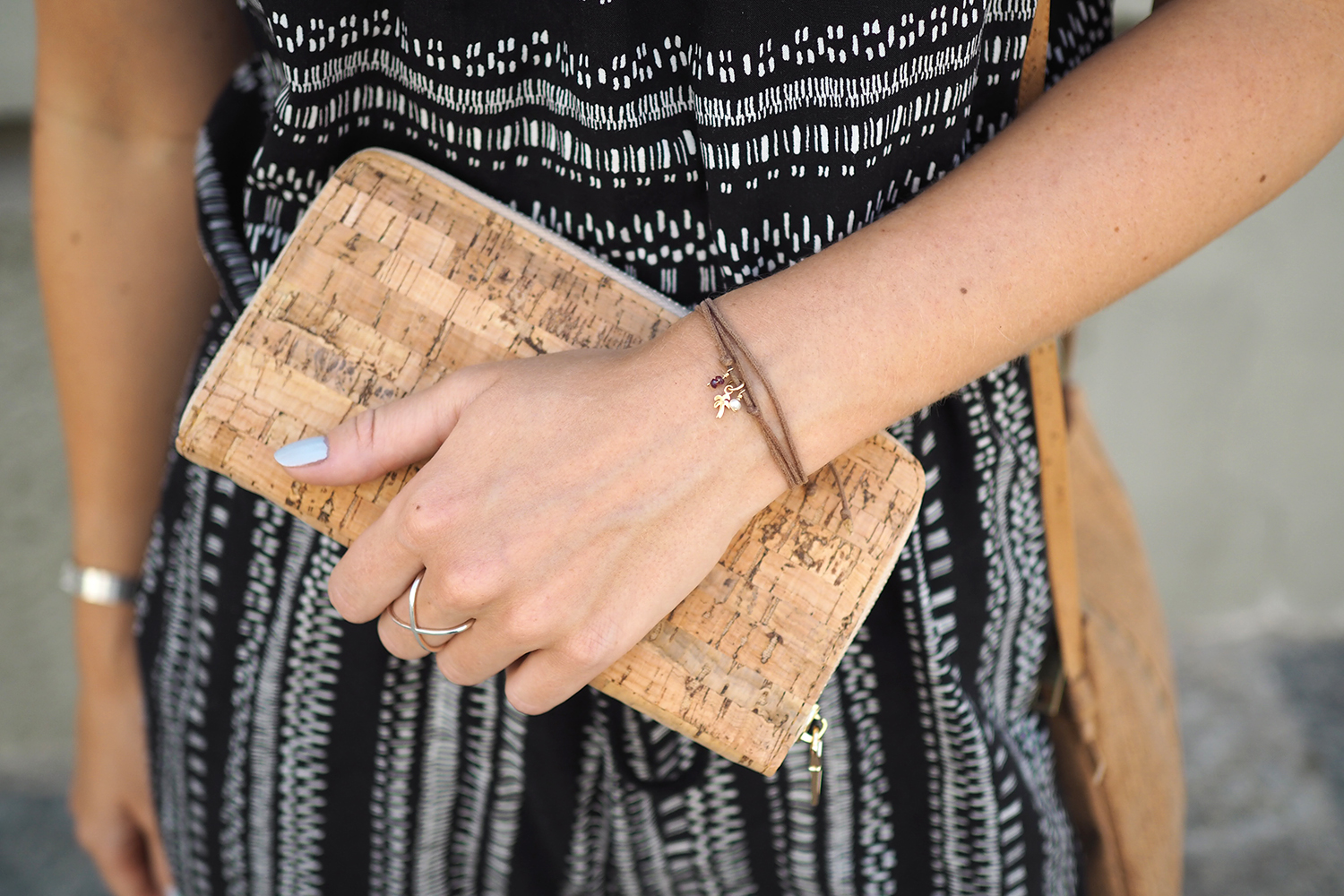 Jumpsuit von Armedangels (fair produziert und aus Tencel) // Tasche und Geldtasche von Weyounique (in Portugal aus Kork produziert) // Schlapfen von Mango (alt) // Sonnenbrille von Ray Ban (vom Flohmarkt) // Ring von I love Blossom (in Wien designt und produziert) // Armband von Camaleoa (Handgemacht in Brasilien)