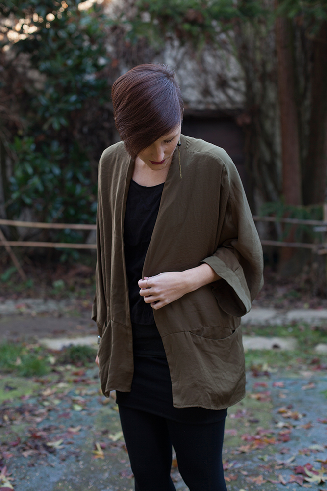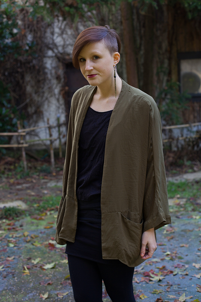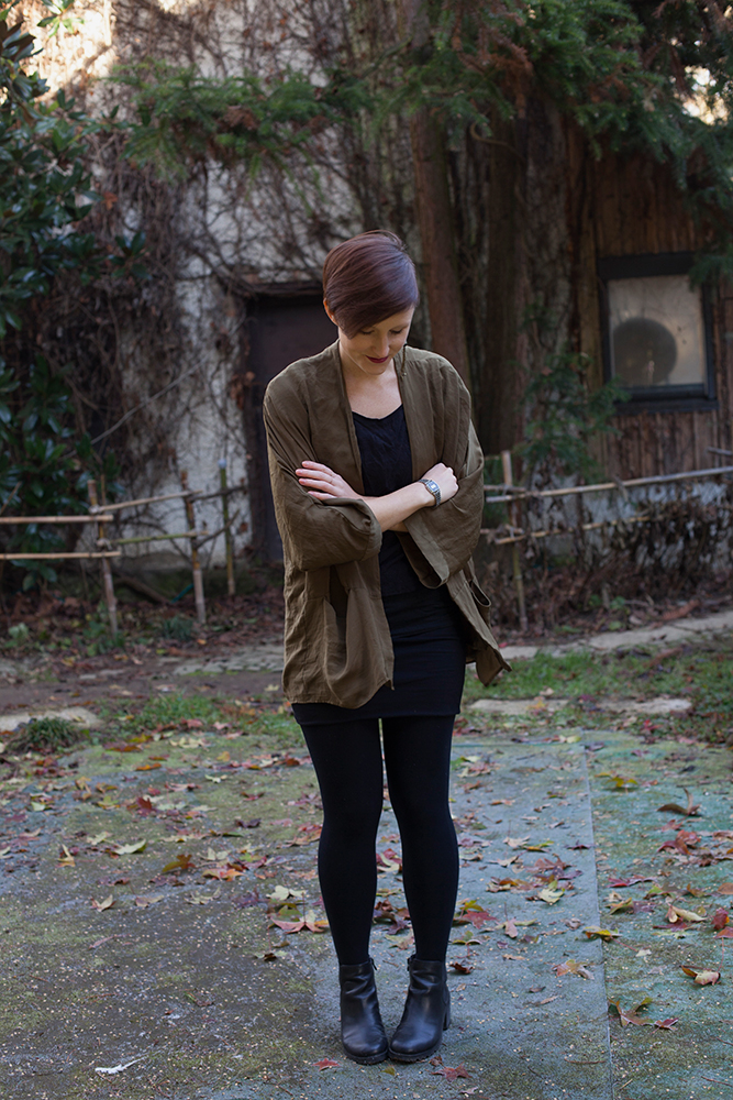 Wenn es für ein paar Tage in die Heimat geht, wie vor zwei Wochen über die Weihnachtsfeiertage, dann finde ich es ausgesprochen angenehm mit leichtem Gepäck zu reisen. So achte ich darauf nur wenige Teile einzupacken, die sich aber unter einander kombinieren lassen. Schwarze Basics, wie Shirt, Rock und Strumpfhose sind deshalb nicht weg zu denken. Als Highlight habe ich diese Basics hier mit meinem olivgrünen Kimono kombiniert, der jedes Outfit sofort aufwertet. Dazu einen passenden Ohrring, etwas Lippenstift und die Feiertage lassen sich gut überstehen!