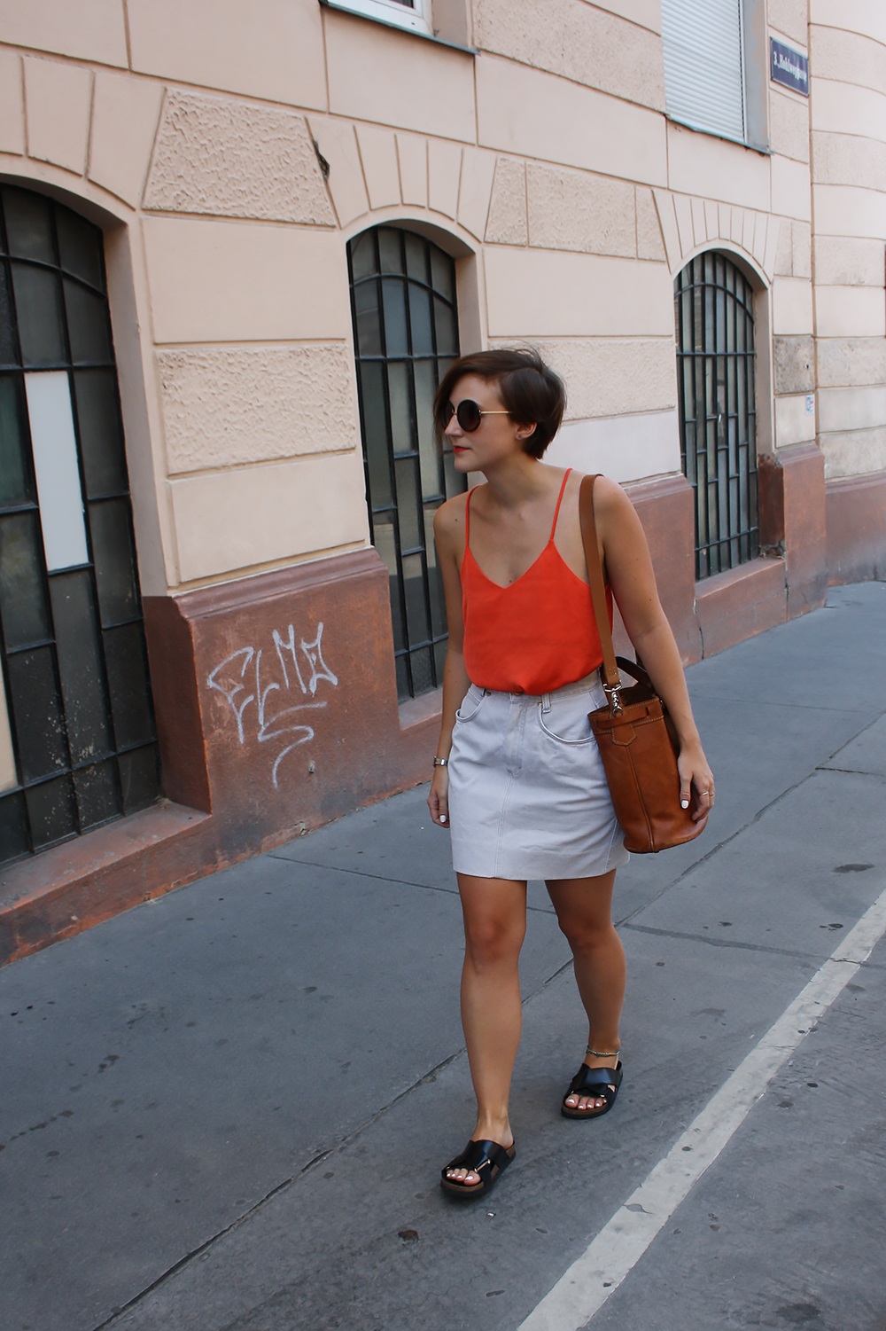 Top und Schmuck von H&M (alt)// Jeansrock von Benetton (Secondhand)// Sliders von Mango (alt)// Tasche ist Vintage