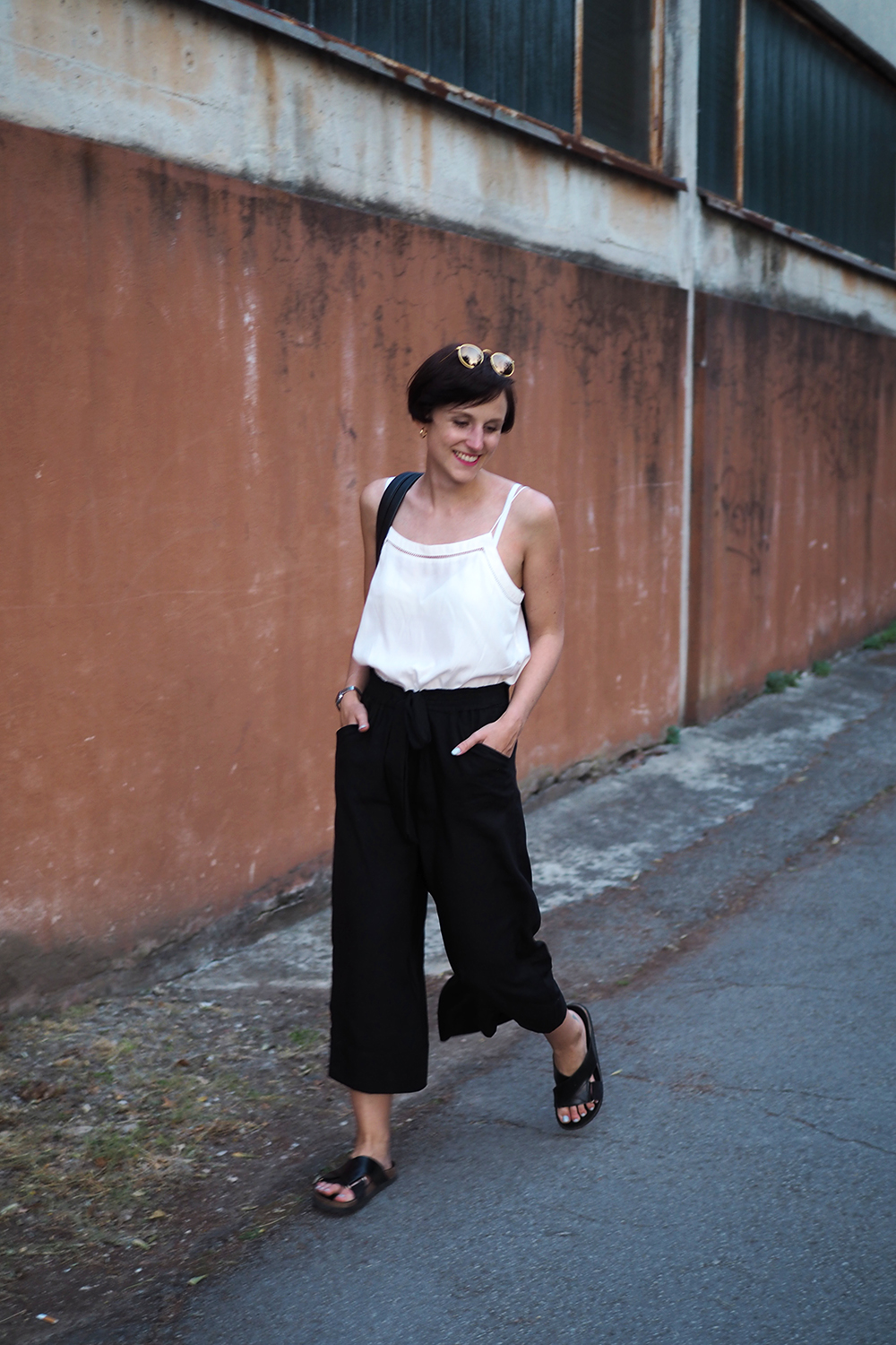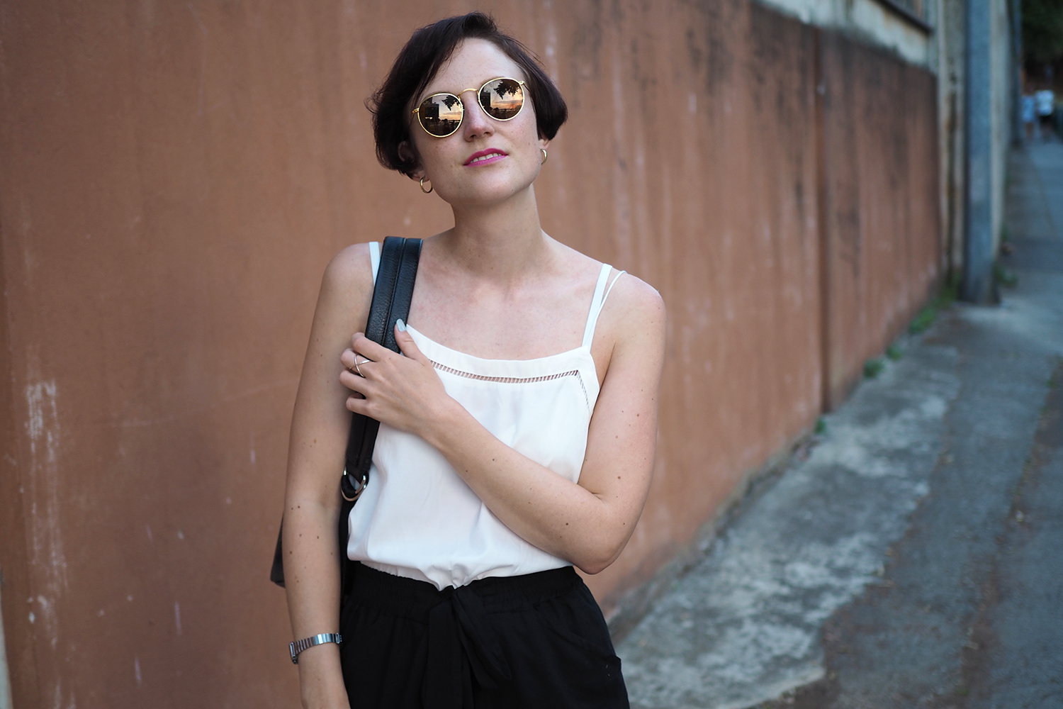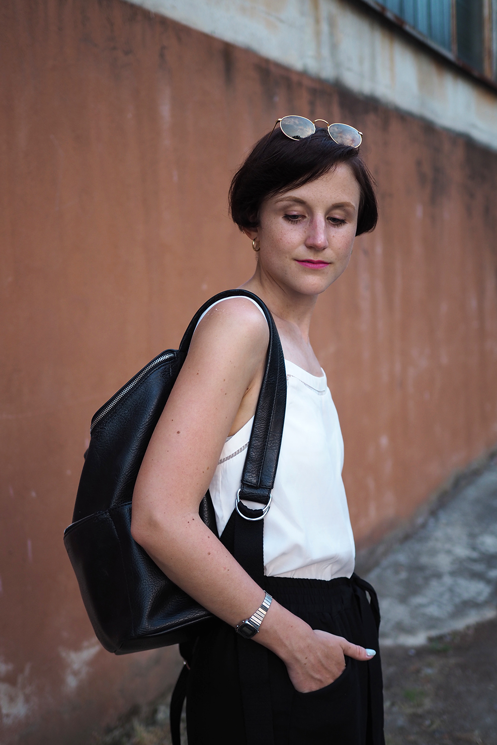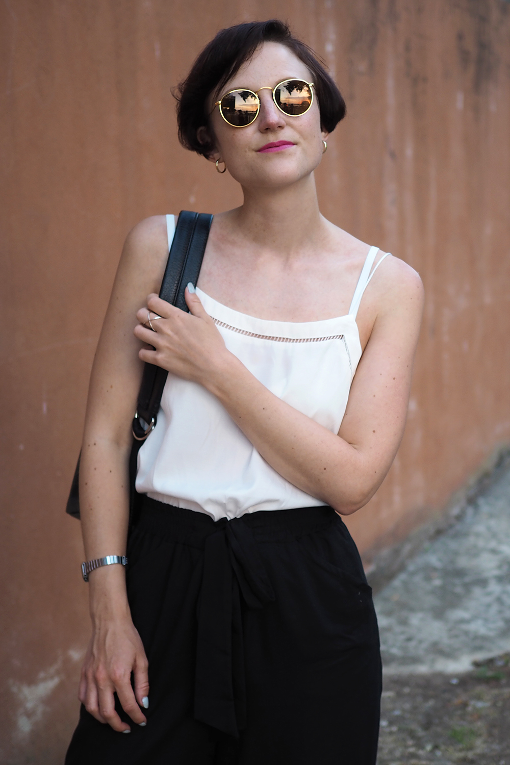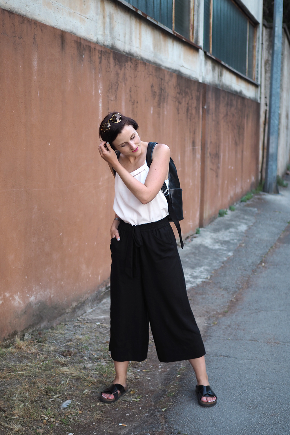 Culotte von Armedangles (fair produziert) // Top und Sonnenbrille vom Flohmarkt // Rucksack von Matt & Nat (fair produziert & vegan) // Ring von I love Blossom //Ohrringe sind Vintage // Schlapfen von Mango (alt)