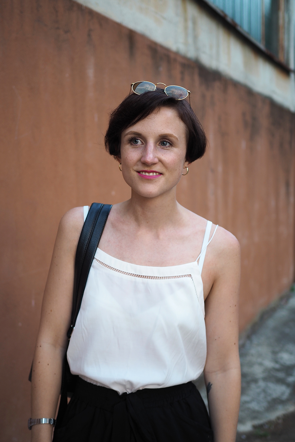 Meine Culotte wurde also zum neuen Lieblingsbegleiter für diesen Sommer. Dank Armedangels greife ich auf eine, aus Tencel, fair produzierte Variante zurück, die ich ohne schlechtes Gewissen tragen kann. Dazu kommt auch noch mein überaus geliebter, ebenso fair produzierter, Rucksack von Mat & Natt, dessen Kunstleder aus Plastikflaschen hergestellt wurde. Der gute Rest wurde zwar nicht fair produziert, ist aber entweder schon sehr alt, wie etwa meine Schlapfen (kann man sagen oder?) oder wurden am Flohmarkt erwirtschaftet, wie dieses nigelnagelneue Top oder die Sonnenbrille.