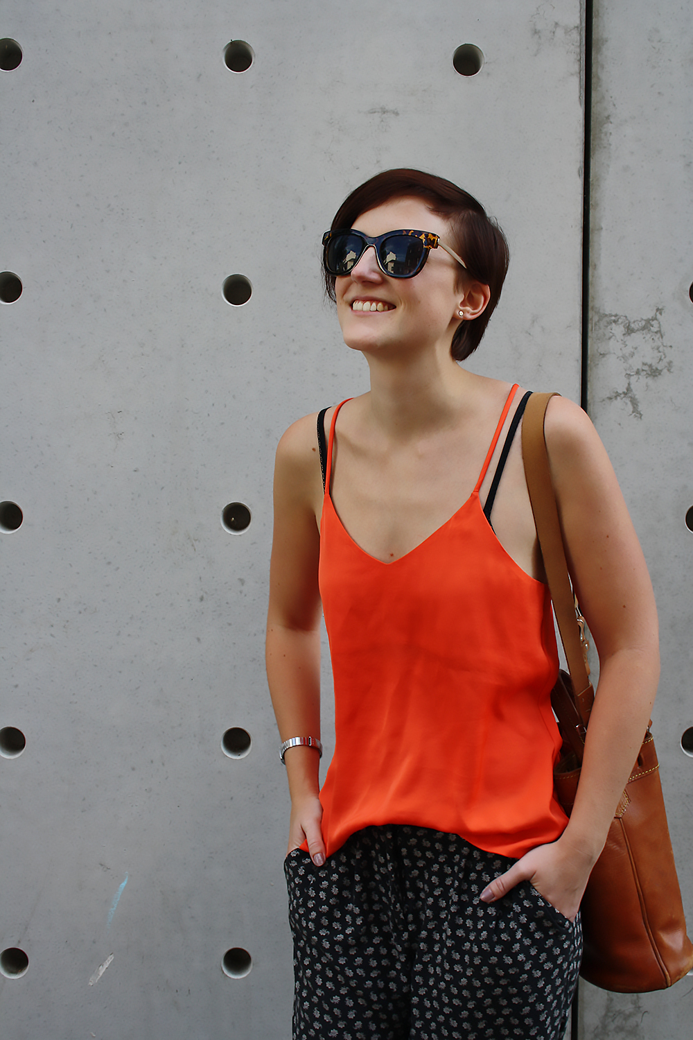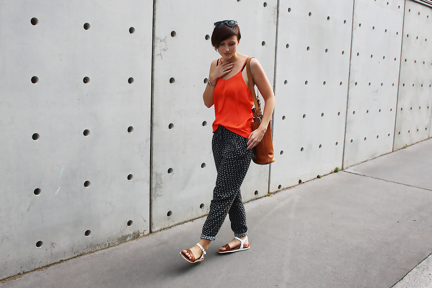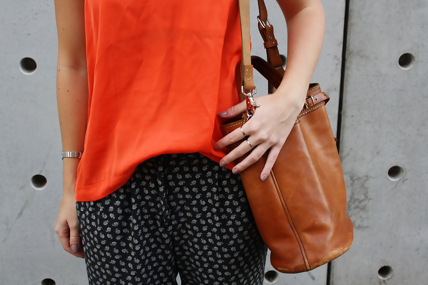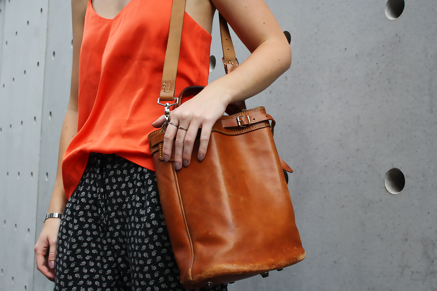Echtes Leder kaufe ich eigentlich selten. Meine Wanderschuhe sind aus echtem Leder und auf Flohmärkte kaufe ich auch immer wieder Schuhe oder Taschen aus Leder. Das finde ich okay, denn immerhin profitiert der Erzeuger nicht mehr davon. Auch wenn Ledertaschen noch so schön sind, eine Neuanschaffung verleiht mir immer schnell ein grausames Gefühl. Also musste ich weiter suchen. Als ich auf Heimaturlaub bei meinen Eltern war ging ich auf Erkundungstour in den Kleiderschrank meiner Mutter. Sie hat eine beachtliche Sammlung an Ledertaschen in allen Variationen. Und tatsächlich hing sie da, diese wunderschöne Bucket Bag. Einige Jährchen schon am Buckel, aber ich liebe ja alte Sachen. Mein Vater hat mir kurzerhand noch schnell einen langen Riemen dran gemacht, so dass ich sie auch um die Schulter tragen kann und meine Mutter konnte sich schnell davon trennen. Was gibt es besseres.