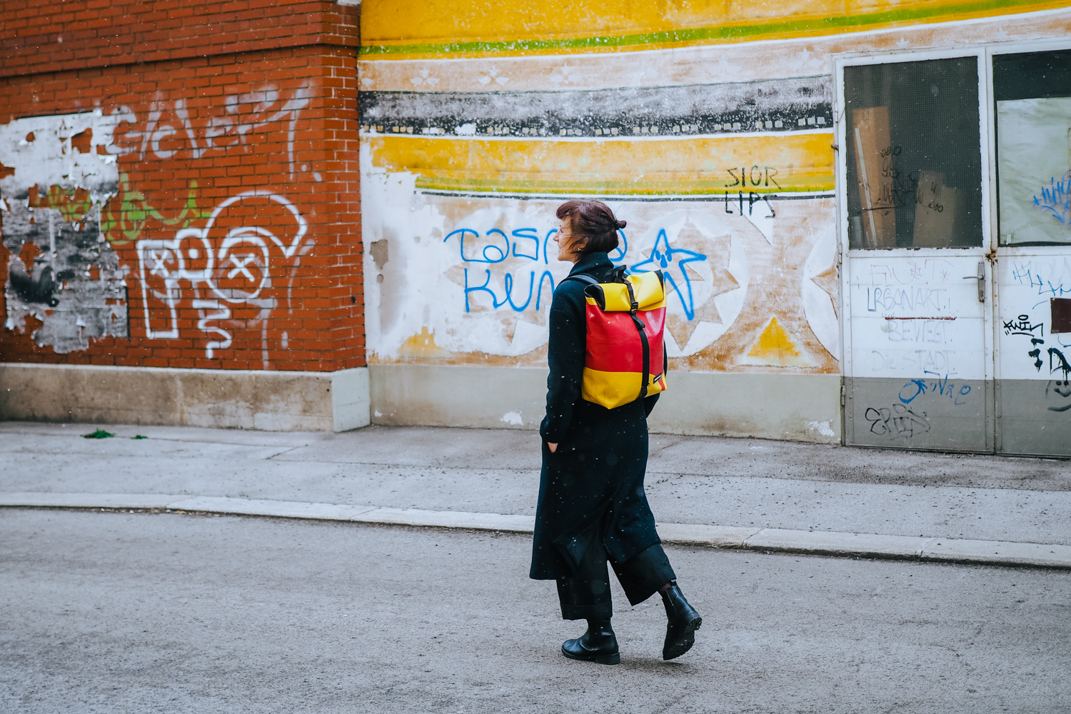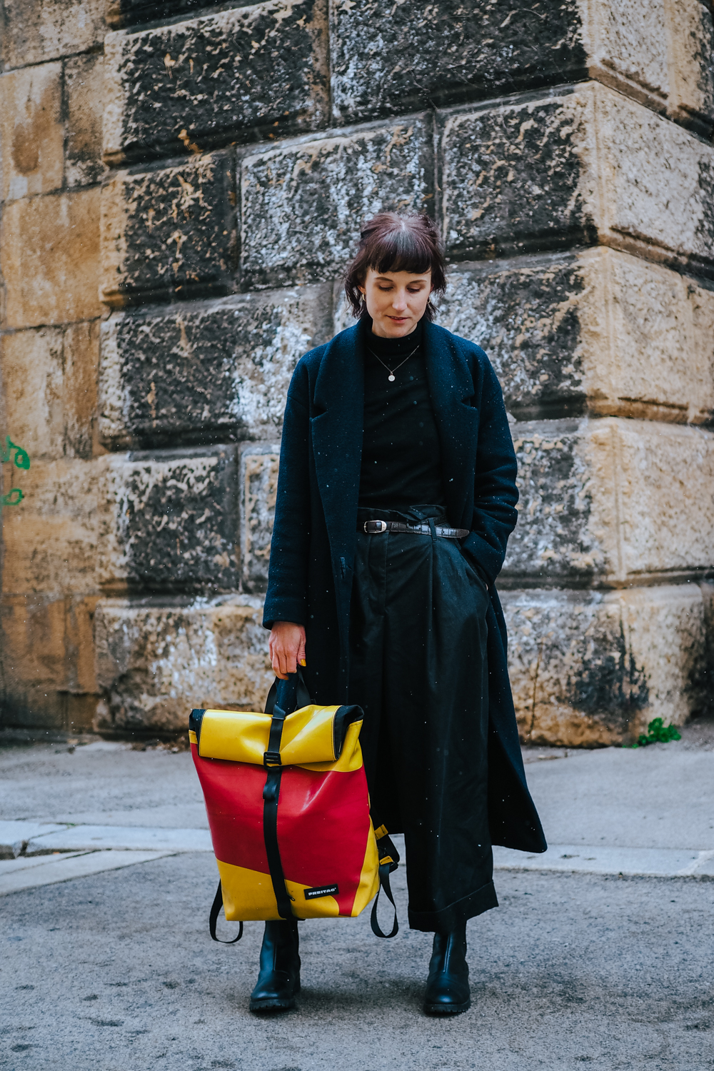 CLAPTON Rucksack, aus alten LKW Planen von FREITAG* – Chelsea Boots, vegan und fair produziert von Wills Vegan Store – Culotte von Armedangels – Gürtel, Rollkragenpullover, Mantel und Ohrringe sind second hand