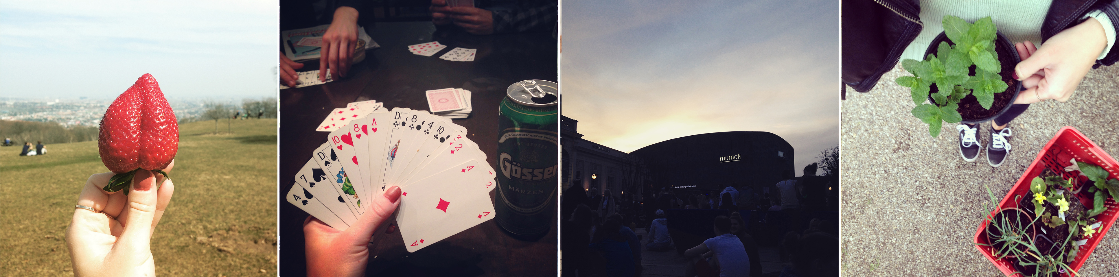 (9)Einen Samstagnachmittag verbrachten wir im Leinzer Tiergarten, wo uns fast ein Wildschwein überrannt hätte. Eine herrliche Aussicht bietet sich hier auf Wien und mit Erdbeeren versüßte ich mir den Tag. (10)Abends gibt’s Kartenspiele. Ich bin offensichtlich in einem Alter angekommen, wo wilde Partynächte gegen gemütliche Spieleabende ausgetauscht werden. (11)Einen darauffolgenden Abend haben wir dann doch ein klein wenig das Wiener Nachtleben ausprobiert und haben uns beim Electricspring im Museumsquartier zu allen anderen auf den Boden gesetzt. (12) Zwischen dem 17. Und 19. April fand im Botanischen Garten, wie jedes Jahr die Raritätenbörse statt. Ich deckte mich dort mit marokkanischer Minze und wildem Basilikum ein.