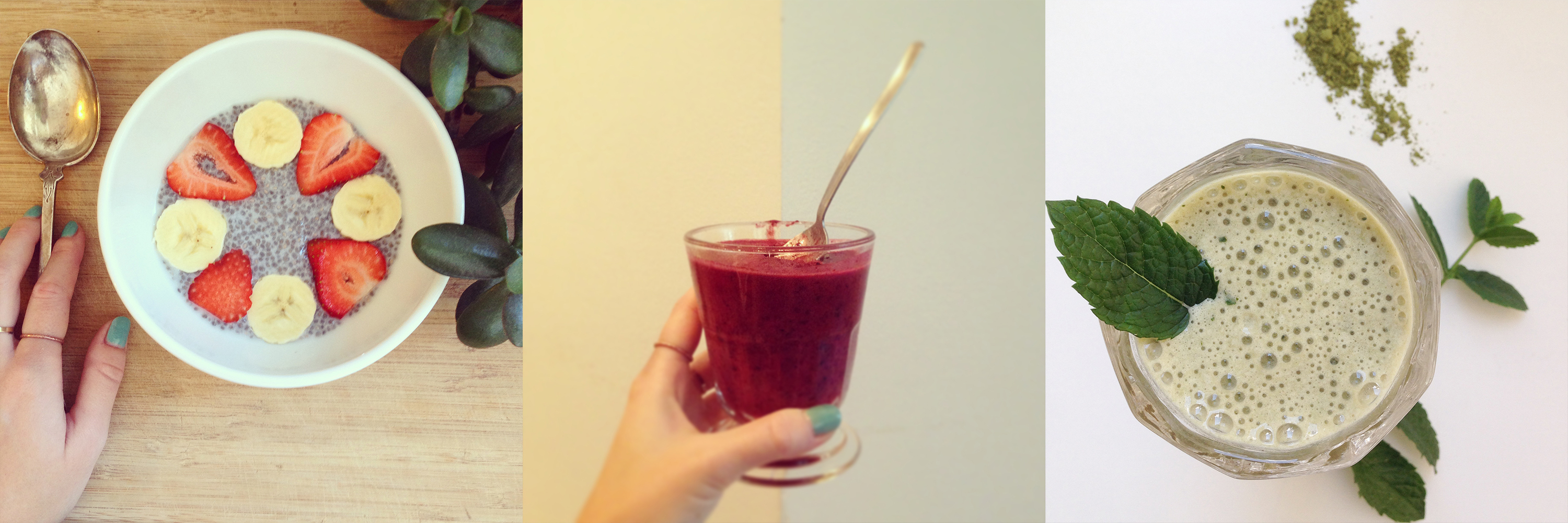 Wenn es früh morgens in die Arbeit geht, gönne ich mir immer gerne eine große Schüssel mit Chiapudding und ganz viel Obst. An den heißen Tagen gab’s dann auch ab und zu mal selbstgemachtes Frozen Yoghurt. Eines meiner absoluten Lieblingsgetränke momentan ist der Matcha-Mint-Smoothie, über den ich auf Viktorias Blog gestolpert bin. So einfach und so unglaublich gut!