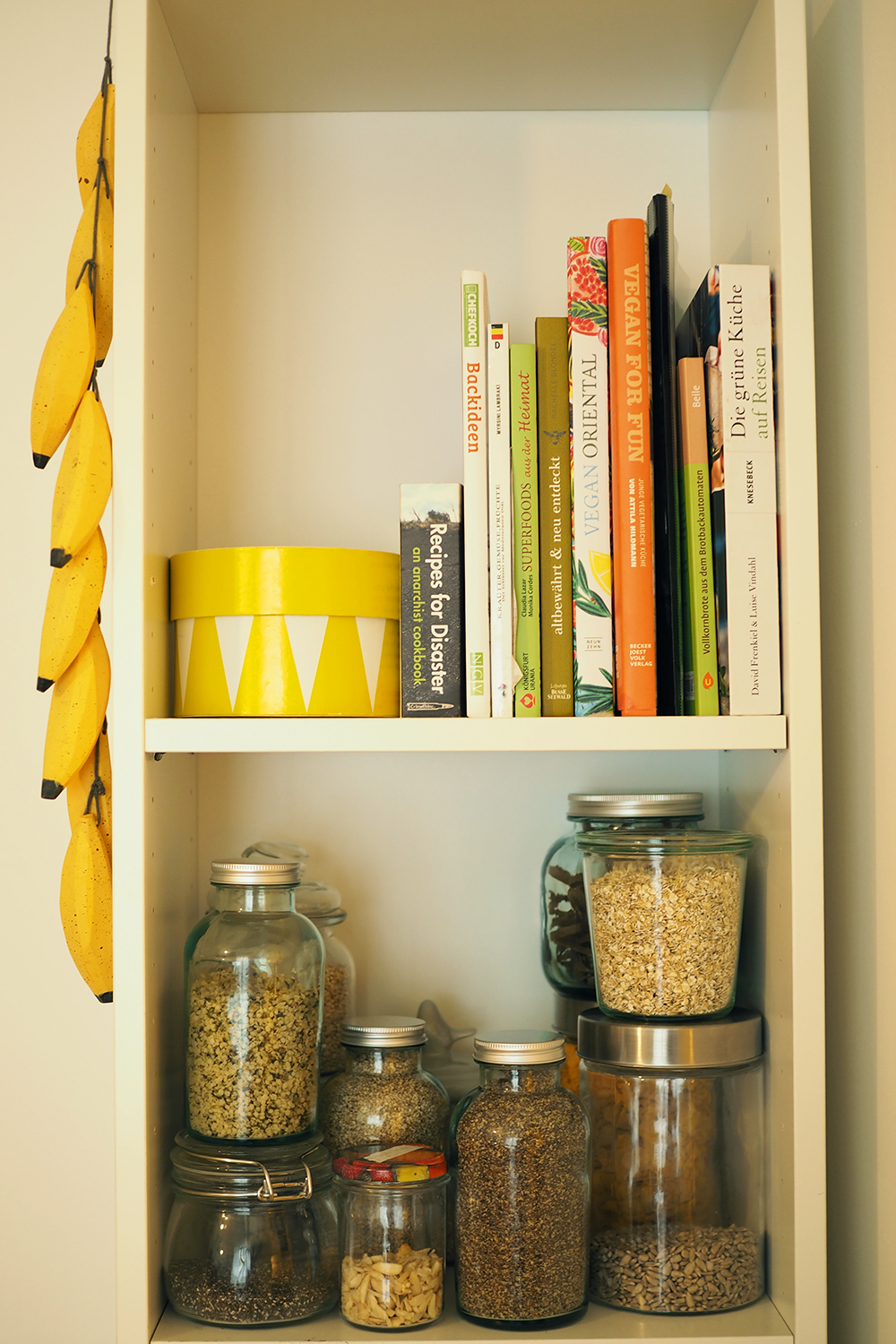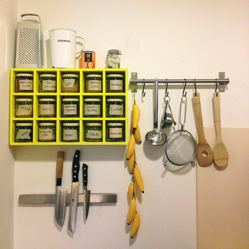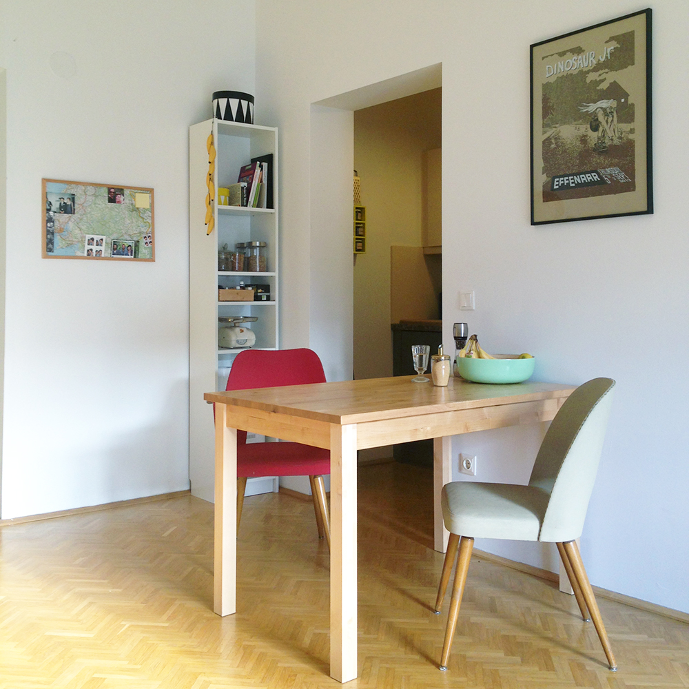 Zu guter Letzt sollen natürlich noch Möbel in die neue Wohnung kommen. Ich hatte aus meiner alten Wohnung eigentlich schon eine gute Menge an Möbel von IKEA und Flohmärkten. Ich persönlich finde ja eine Mischung aus beidem macht so eine Wohnung erst richtig gemütlich. Man braucht nicht immer gleich neue Designermöbel, um eine schicke Wohnung zu haben. Natürlich fehlten uns noch einige Dinge, wie etwa ein Esstisch, ein großer Kleiderkasten, ein Spiegelschrank und noch so einiger anderer Kram. Einen fast neuen Esstisch konnten wir zu einem günstigen Preis über Willhaben ergattern. Da wir kein Auto zur Verfügung hatten, war es besonders wichtig für uns, dass der Tisch nicht allzu weit weg ist und wir ihn entweder mit den Öffis oder zu Fuß transportieren konnten. Bei Willhaben kann man aber ganz praktisch seinen Bezirk auswählen und gleich im Vorhinein in Erfahrung bringen, wo der Tisch zum Abholen ist. Da wir nicht sehr wählerisch waren, haben wir uns einfach den Tisch ausgesucht, der am nächsten zu uns verkauft wird. Tatsächlich fanden wir in der Parallelstraße zu uns ein tolles Angebot und konnten den Tisch einfach zu Fuß abholen und in die neue Wohnung transportieren. Die einzigen neuen Möbel die wir uns schlussendlich kauften waren ein PAX Schrank von IKEA und einen Spiegelschrank von Mömax. Ein Gewürzregal haben wir mit Hilfe meiner Eltern aus einem alten Blumenkistchen und alten Zwergwiesen-Aufstrichgläsern gebastelt. Eine hervorragende Hilfe beim Kochen! Für Dübel und Schrauben fanden wir übrigens auch einen tollen Laden gleich bei uns ums Eck. Lets do it ist ein Werkzeug und Heimwerker Geschäft in dem man die gewünschte Anzahl an Schrauben, Dübel, Nägel und was weiß ich was auch unverpackt mitnehmen kann. Eine tolle Alternative zu herkömmlichen Heimwerker Großkonzernen.