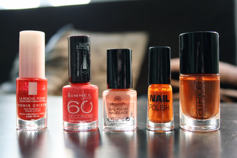 La Roche Posay nr.33; Rimmel London nr.430 Coralicious; Alessandro nr.218; H&M sunset dreams; Catrice nr.560 rusty but sexy American Apparel malibu green; Look by Bipa nr.29 grass; Rimmel London nr.170 lively lilac; H&M liberty girl; Catrice nr.490 iron mermaiden; Rimmel London nr.805 grey matter; Catrice nr.570 beavis & mud-head; Essence nr.12 very diva; Essence nr.59 black is back Essence nr.02 circus confetti; H&M clear; Essence…