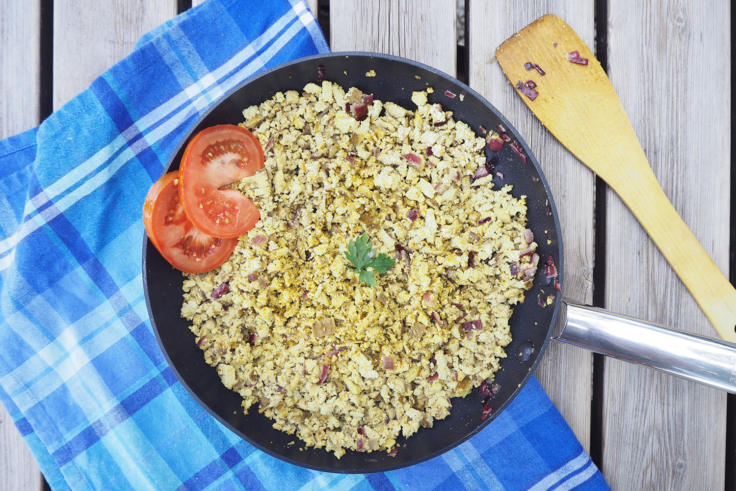 Statt wie bei der Milch gibt es für das Ei keinen eindeutigen Ersatz, den man für alles einsetzen kann. Hier darf man ruhig ein bisschen kreativer werden. Im Reformhaus gibt es das klassische Egg-fix, welches im Prinzip, angerührt mit Wasser, wie ein normales Ei verwendet werden kann. Ist einem der Weg ins Reformhaus zu lang oder hat man keine Lust 6€ dafür auszugeben, kommt man ganz gut mit Banane, Tofu, Mehl oder pflanzlichem Öl weiter. Sojamilch mit Sojamehl gemischt ergibt eine super Basis um etwa Semmelknödel zu binden. Mit Tofu bekommt man die perfekte vegane Eierspeis hin, das sogenannte Tofu-Scramble, eine reife Banane versüßt nicht nur Pancakes, sondern bindet auch den Teig dafür und mit einer Tasse Sonnenblumenöl wird jeder Kuchen super luftig. Auch Gewürze sind eine hervorragende Lösung um Mahlzeiten, ohne Ei geschmackvoller zu gestallten. Dafür gibt’s zum Beispiel im Supermarkt schon eigene vegane „Eiersepeis- Gewürze“ und ähnliches.