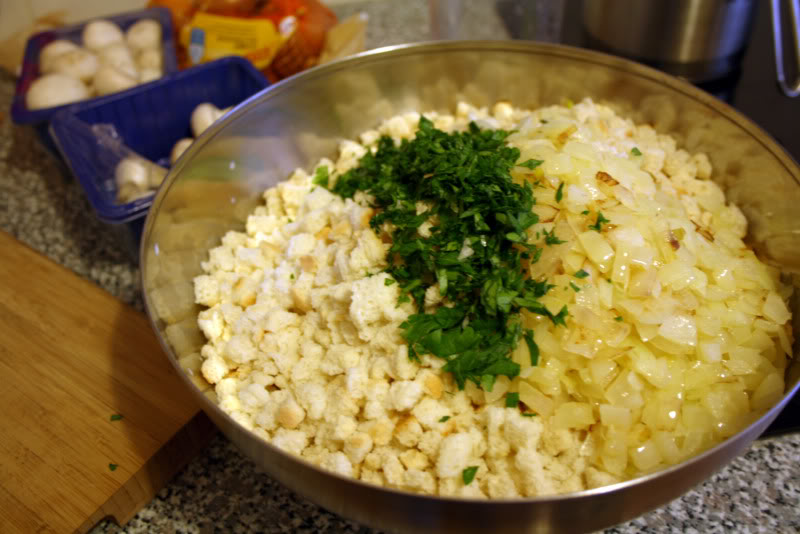 Die klein gehackte Zwiebel in Butter anbraten und mit der klein gehackten Petersilie, den Semmelwürfel, dem Salz, den zwei Eiern und der warmen Milch vermischen. Am besten mit den bloßen Händen in einer sehr großen Schüssel. Es entsteht nämlich nun ein richtiger „Teig“, der geknetet werden muss. Knetet den „Teig“ in eine Brotähnliche Form und lasst ihn dann für eine Stunde ruhen.