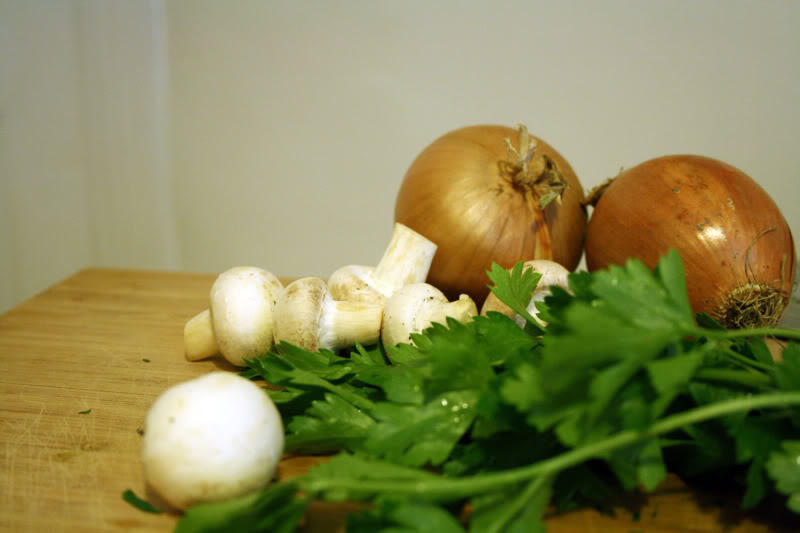Die Zwiebel wieder einmal klein hacken und in Öl anbraten, währenddessen die Champignons in mundgerechte Stücke schneiden und dazu geben. Den Schlag mit dem Mehl gut verrühren und schließlich mit den Champignons und der Zwiebel in der Pfanne vermischen. Mit Salz und Pfeffer abschmecken und zum Schluss die fein gehackte Petersilie hinzufügen.