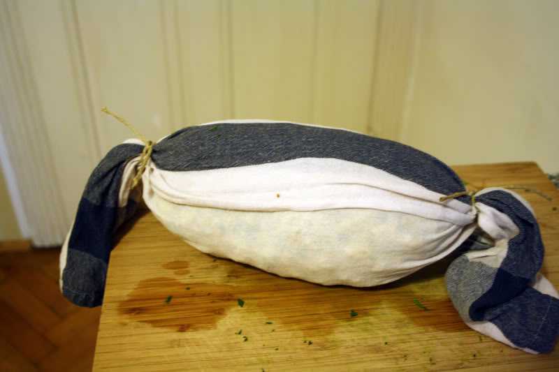 Nach einer Stunde braucht ihr einen großen Topf (eben groß genug, dass das „Brot“ reinpasst) in dem ihr Salzwasser zum kochen bringt. Während das Wasser am Herd steht müsst ihr das Knödelbrot in ein nasses Geschirrtuch einwickeln, damit er während dem Kochen nicht auseinander fällt und die Form behält. Am besten ihr bindet die Enden mit einem dicken Faden zu, da kann dann nichts passieren. Wenn das Wasser kocht, legt ihr vorsichtig das Brot samt Geschirrtuch in den Topf und dann lasst ihr es auf mittlerer Stufe weiter eine Stunde lang köcheln.