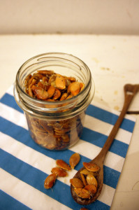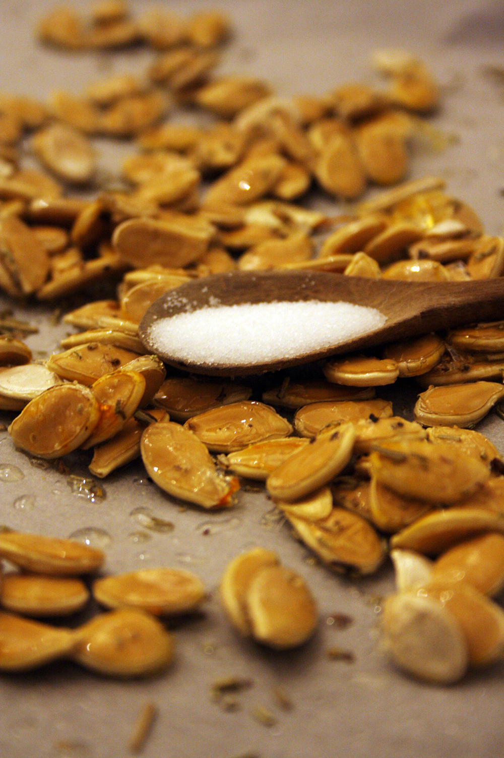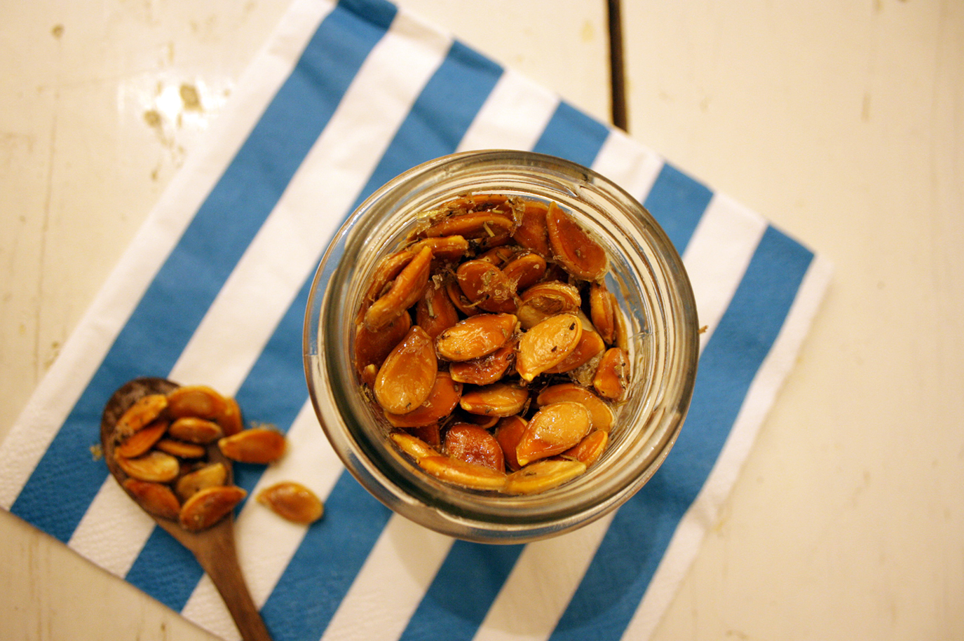Ich habe mich für geröstete Kürbiskerne entschieden, weil ich sie einfach liebe. Egal ob als Snack für zwischendurch, auf dem Salat oder der Suppe: geröstete Kürbiskerne sind einfach Alleskönner! Super schnell sind sie zubereitet und noch dazu total gesund. Neben Vitamin E, Magnesium, Eisen und Zink enthalten sie noch weitere Nährwerte, die beispielsweise gegen Krebs vorbeugen sollen. Gewürzt habe ich meine Kürbiskerne mit Salz, Pfeffer und Rosmarin. Eine herrlich mediterrane Variante. Natürlich geht’s auch ganz klassisch nur mit Salz, oder süß mit Zucker und Zimt.
