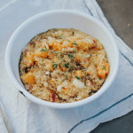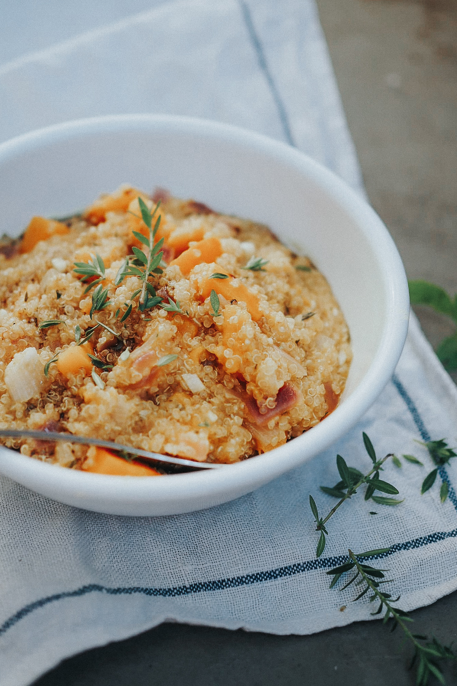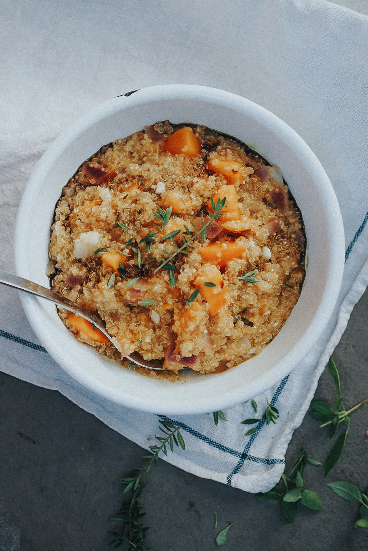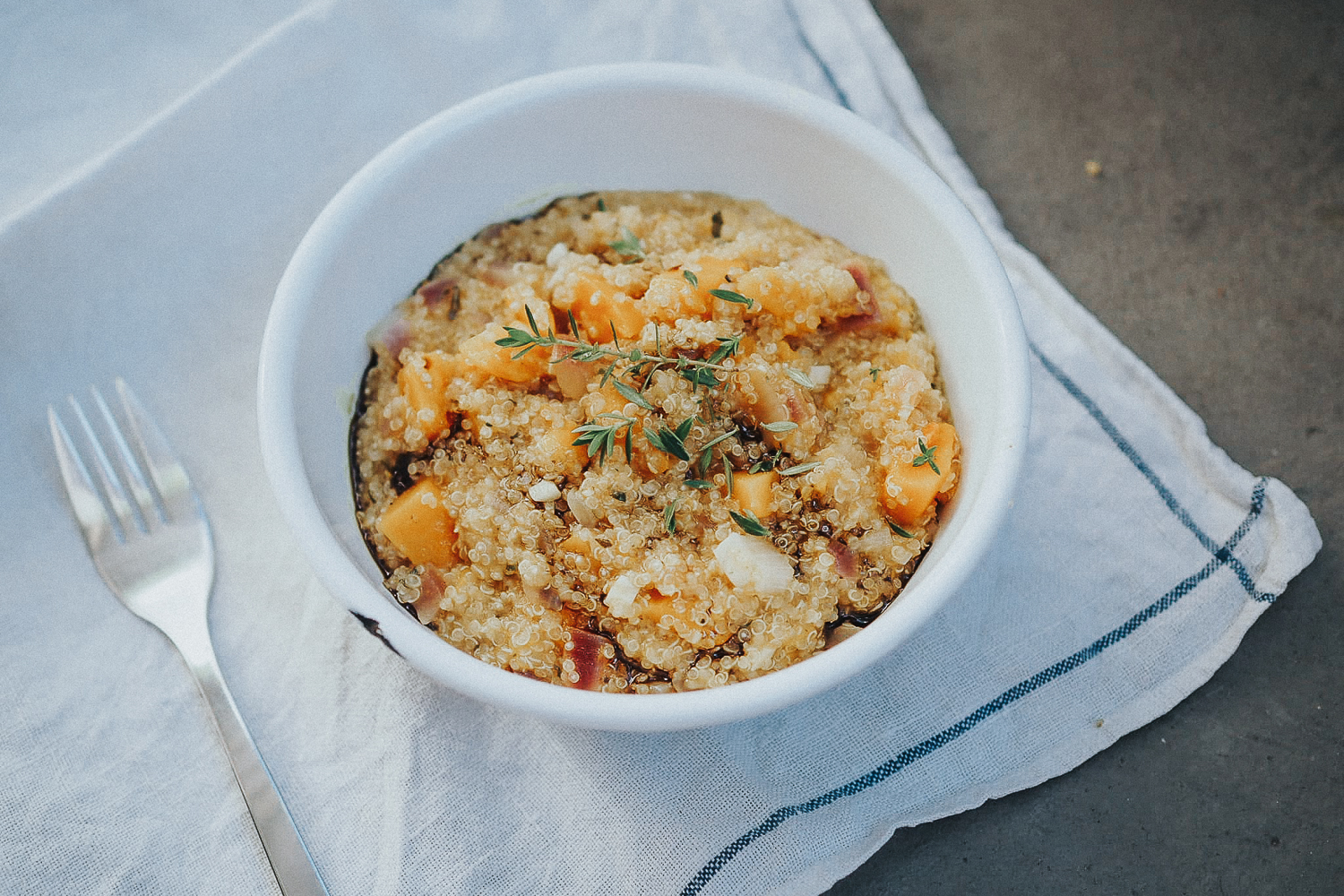 Momentan bekommen wir wieder viel Kürbis im Gemüsekistl. Vielleicht ein Anzeichen dafür, dass der Herbst nicht mehr all zu weit weg ist? Kürbis geht immer! Und wisst ihr, was ich auch einfach immer essen könnte? Risotto! Und damit das mit dem Reis nicht zu einseitig wird, machen wir das Risotto eben einfach mit Quinoa. Der ist nämlich oben drein auch noch ein hervorragender Protein-Lieferant und passt perfekt zu Weißwein, Knoblauch und Kürbis!