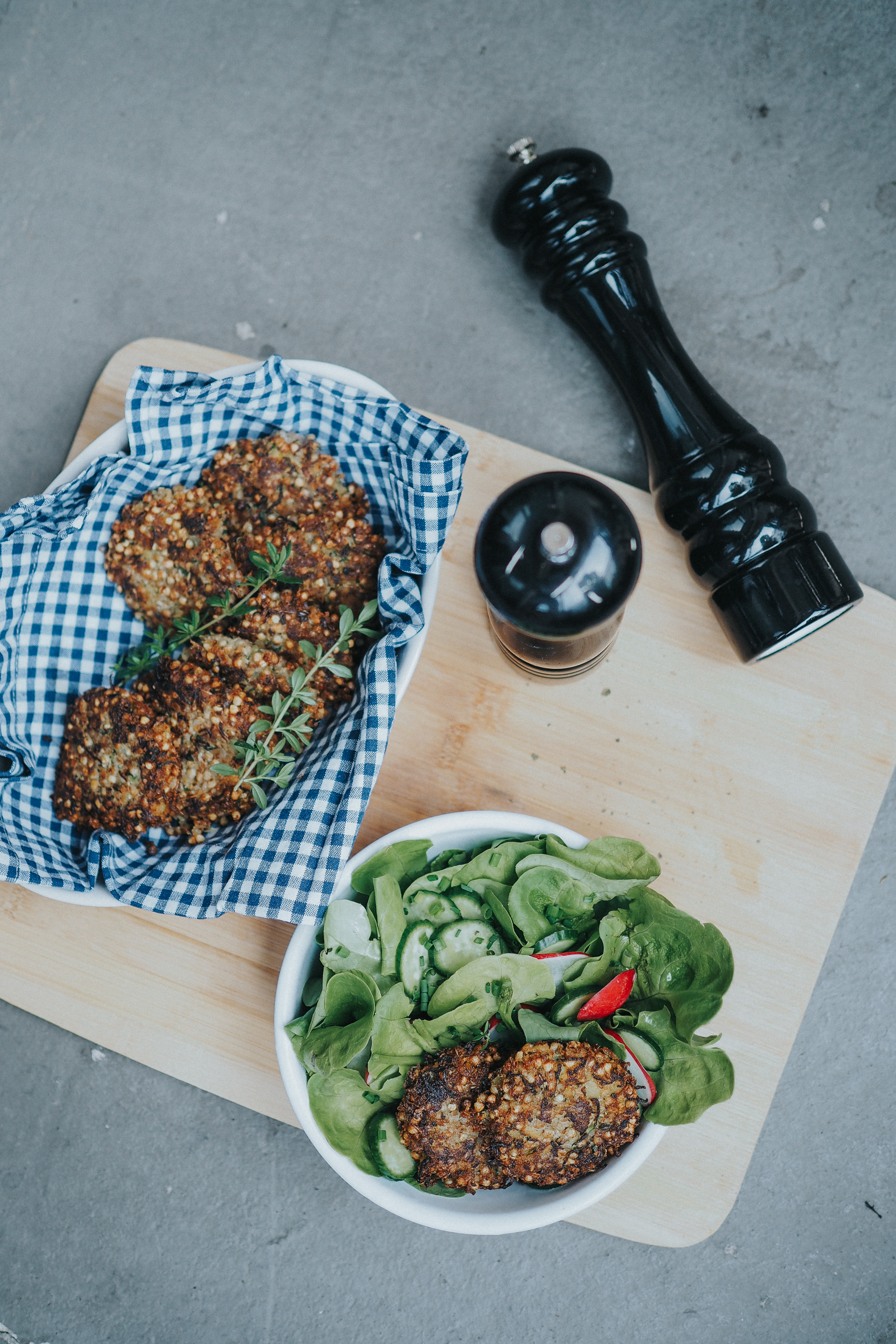 Diese Version habe ich mit Buchweizen gemacht. Das Buchweizen kann aber auch gut und gerne mit Hirse, Reis oder anderem Getreide ersetzt werden. Es eignet sich hervorragend dazu, den übrigens Beilagen-Reis oder das nicht aufgegessene Risotto weiter zu verwerten. Die Konsistenz ist hierbei auf jeden Fall das wichtigste. Damit das Patty in der Pfanne nicht zerbröselt gibt es ein paar Möglichkeiten: ein Mehl-Sojamilchgemisch, jedoch geht hier oft sämtlicher Geschmack verloren; Mandelmuß, das ist jedoch etwas teuer doch die einfachste Variante ist eine gekochte Kartoffel! .Ja, richtig gehört! Sie ersetzt quasi das Ei, weil sie sehr viel Stärke produziert und deshalb bindet. Generell gilt je mehr „flüssiges“ Gemüse drinnen ist, desto mehr Brösel werden benötigt, denn die saugen die Flüssigkeit auf.