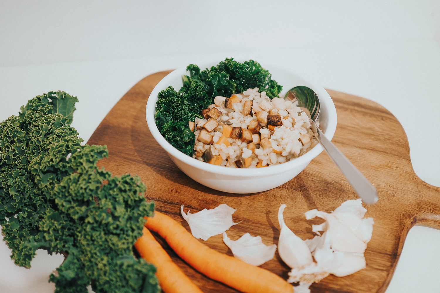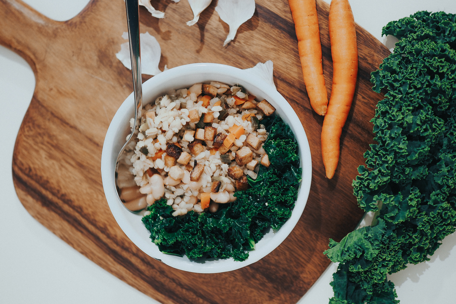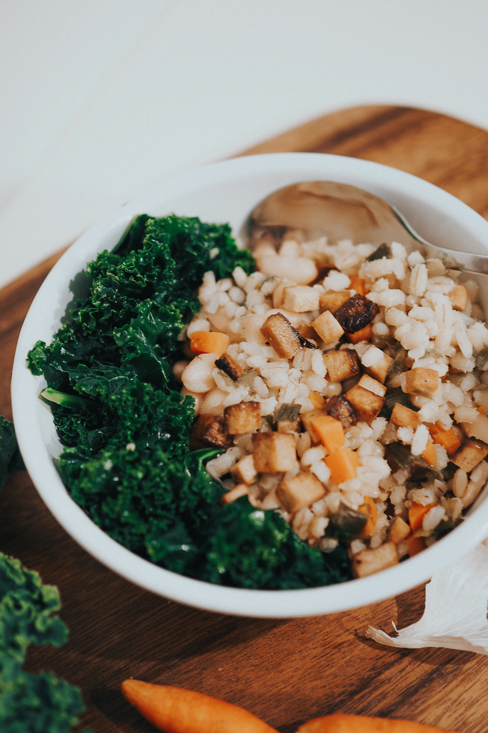 Seither wurde das vegane Ritschert zu einer meiner Lieblingsmahlzeiten im Winter und mindestens einmal im Monat wird es gekocht. Die Kombination aus Gerste und Bohnen ist meiner Meinung nach unschlagbar und die würzige Note vom Tofu rundet das ganze noch ab. Im Prinzip schon eine ganze Mahlzeit in sich, aber um noch ein paar Vitamine drunter zu mischen, koche ich eigentlich immer ein grünes Gemüse dazu, welches ich gerade zuhause habe. Immerhin befinden wir uns nicht mehr in der Steinzeit und wir können aus der Hülle und Fülle des saisonalen Gemüse schöpfen. In diesem Fall war das Grünkohl, aber natürlich passt auch Spinat oder Mangold richtig gut dazu.