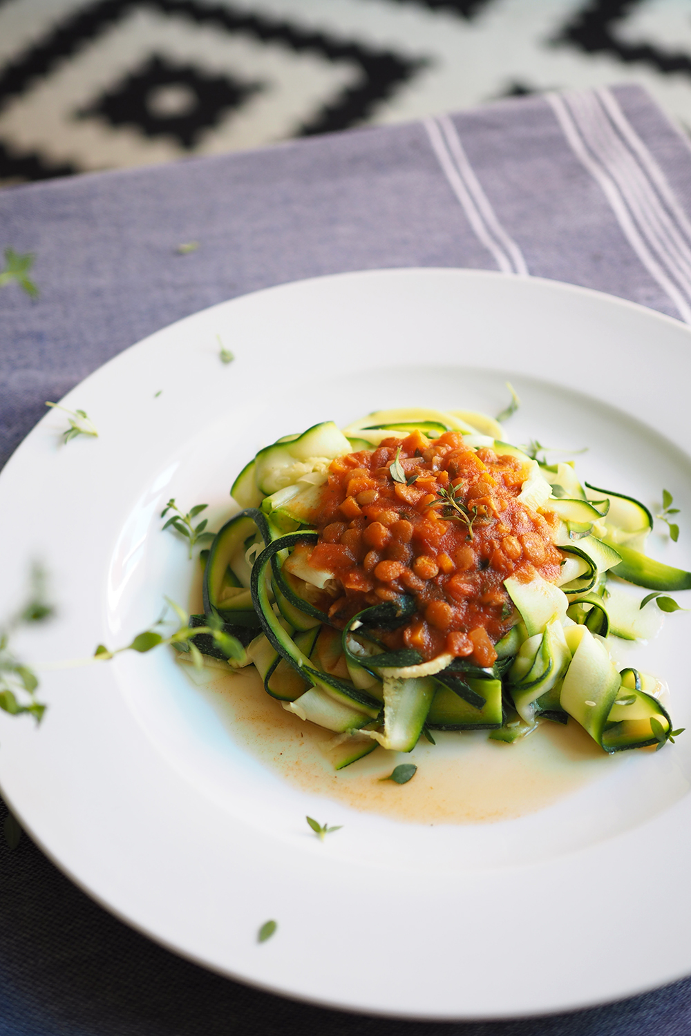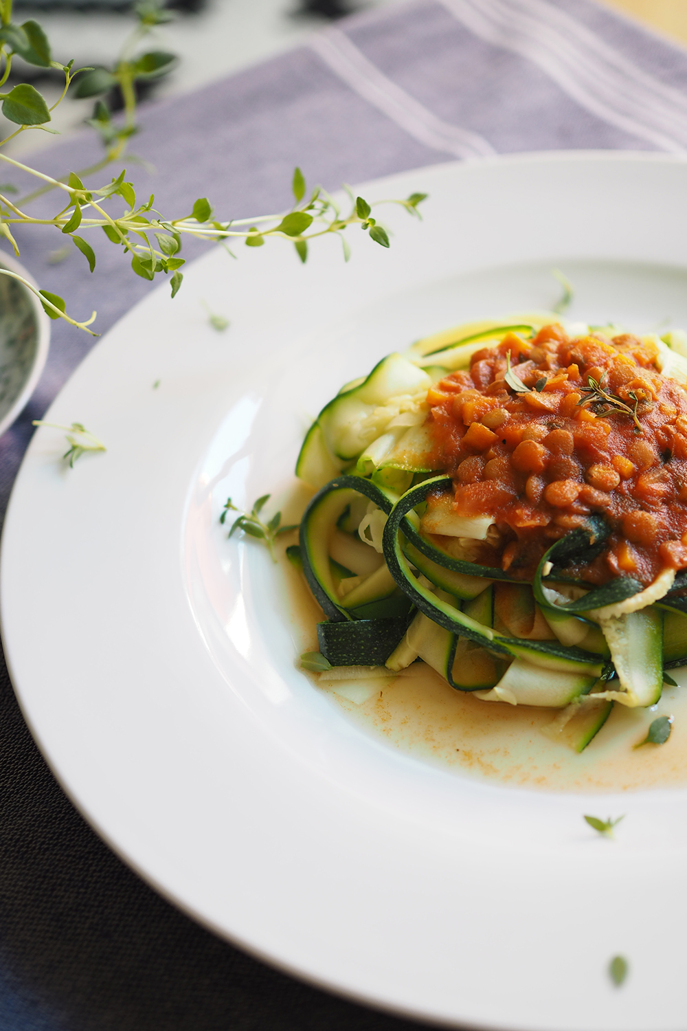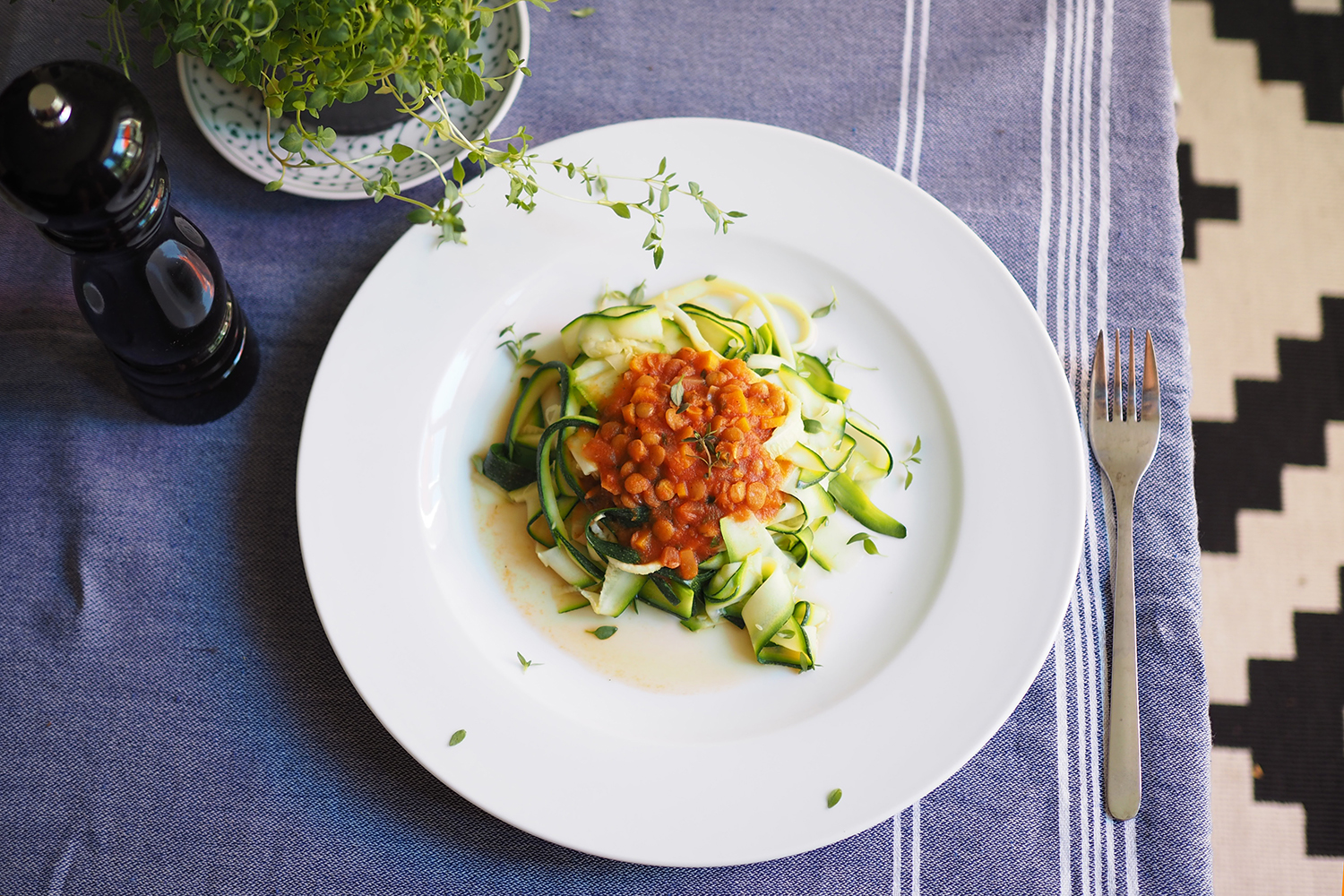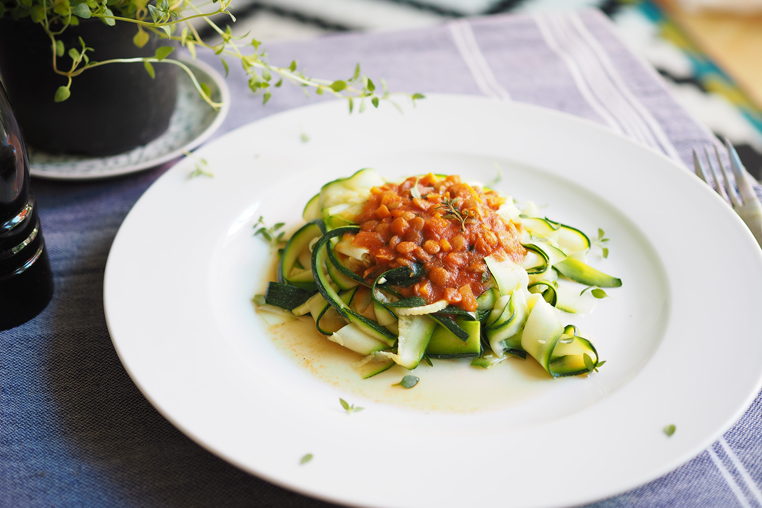 Tatsächlich braucht man nichts anderes als einen stink normalen Karotten- oder Kartoffel Schäler mit dem man Tagliatelli-artige Zucchini-Nudeln herstellen kann. Das Ganze ist zwar mit etwas Aufwand verbunden, lohnt sich aber alle mal! Als Sauce oben drauf entschieden wir uns für etwas sättigendes, aber trotzdem gesundes: Linsen! Sie gehören sowie so zu meinen absoluten Lieblingslebensmittel. Diese Hülsenfrüchte enthalten nämlich nicht nur eine ordentliche Portion Proteine, sondern auch weitere wichtige Inhaltsstoffe, wie Magnesium und Eisen. Gemeinsam mit einer guten Mischung aus Gemüse kann man daraus eine ganz hervorragende vegane Bolognese zaubern, die obendrein noch super gesund ist.