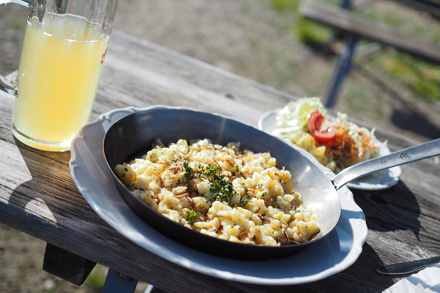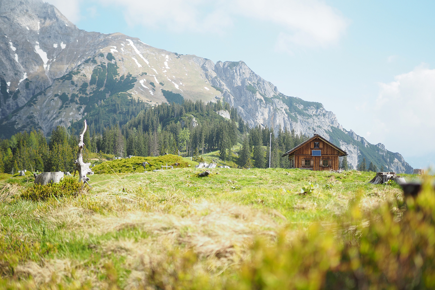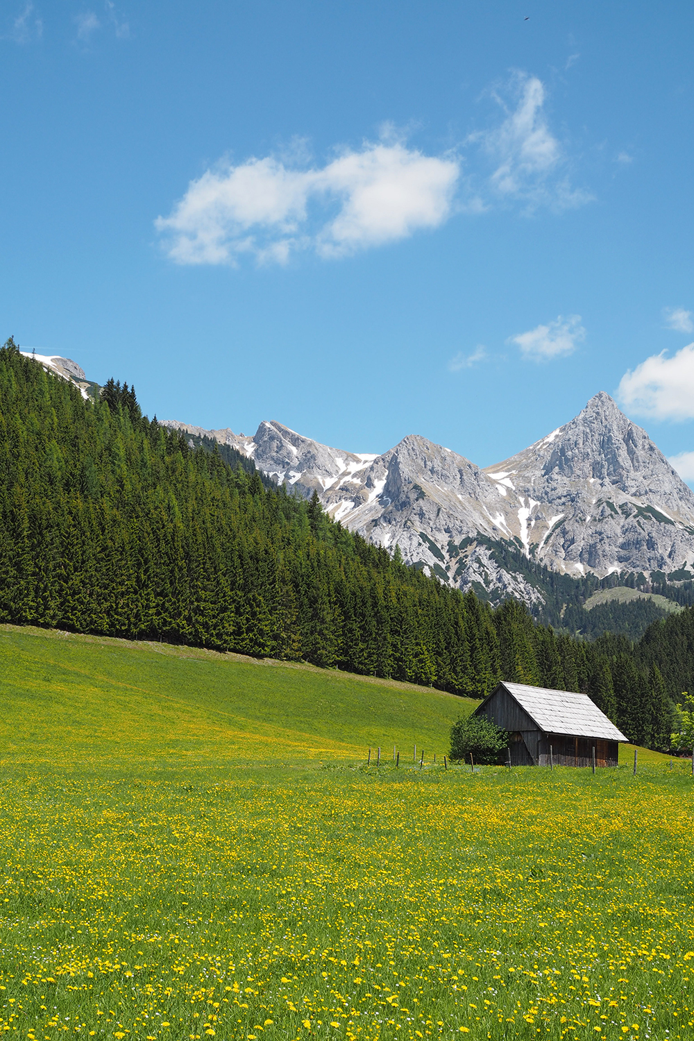 Über einen Parkplatz wandert man über Wiesen und Forstwege über das Schloss Kaiserau immer näher in Richtung Admonter Kalbling (2196m). Die Besteigung von jenem Gipfel, soll angeblich auch wunderschön sein und ist von der Klinke Hütte aus gut zu halten. Da wir allerdings noch weiter zur Mödlinger Hütte wollten, mussten wir die Gipfelbesteigung auslassen. Kurz vor der Klinke Hütte geht’s dann noch mal steil bergauf, aber nicht lange, so erreicht man nach insgesamt drei Stunden Gehzeit die erste Hütte um Rast zu machen. Nach einer Frittatensuppe und einem Espresso setzten wir unsere Wanderung fort.