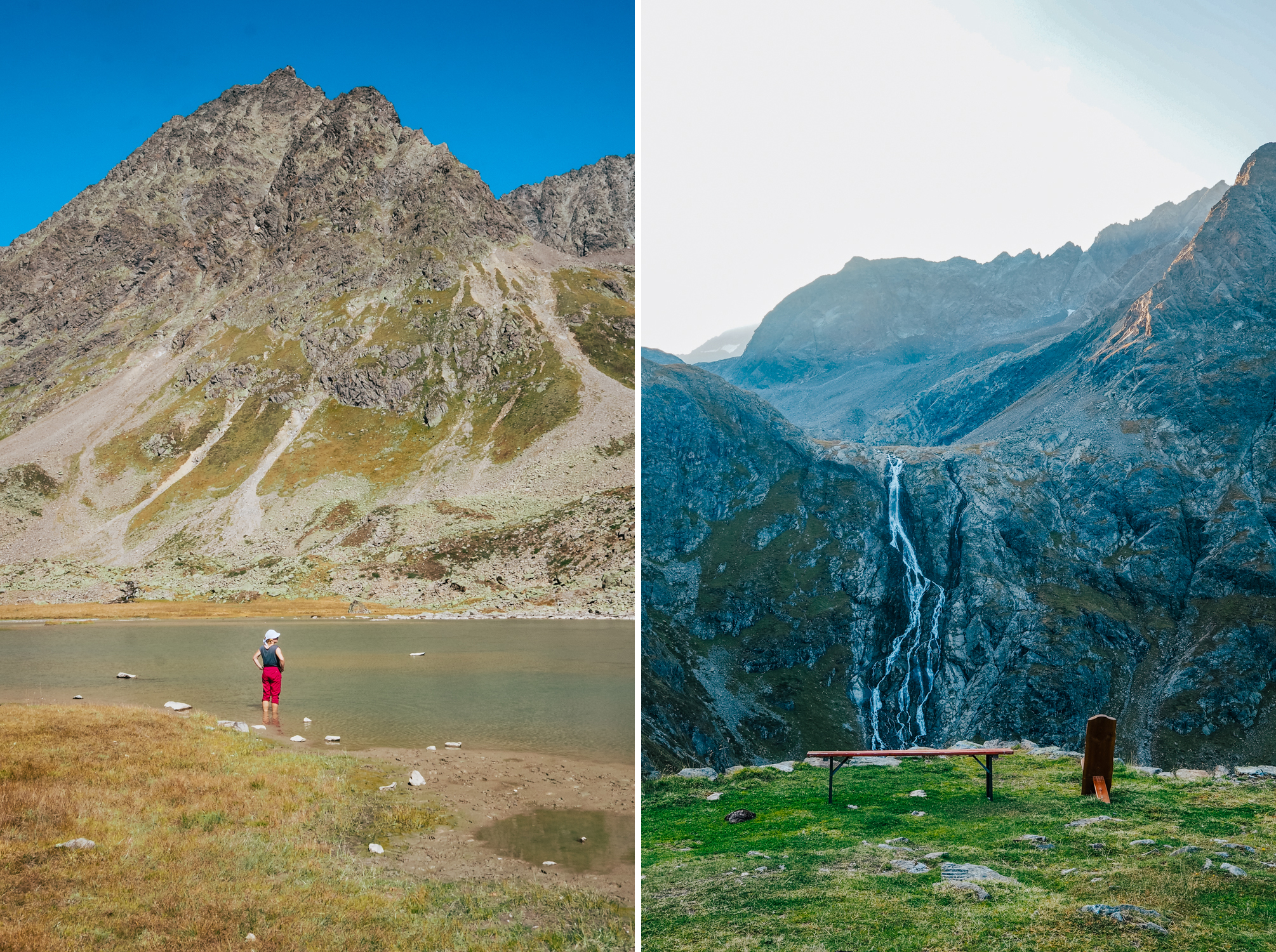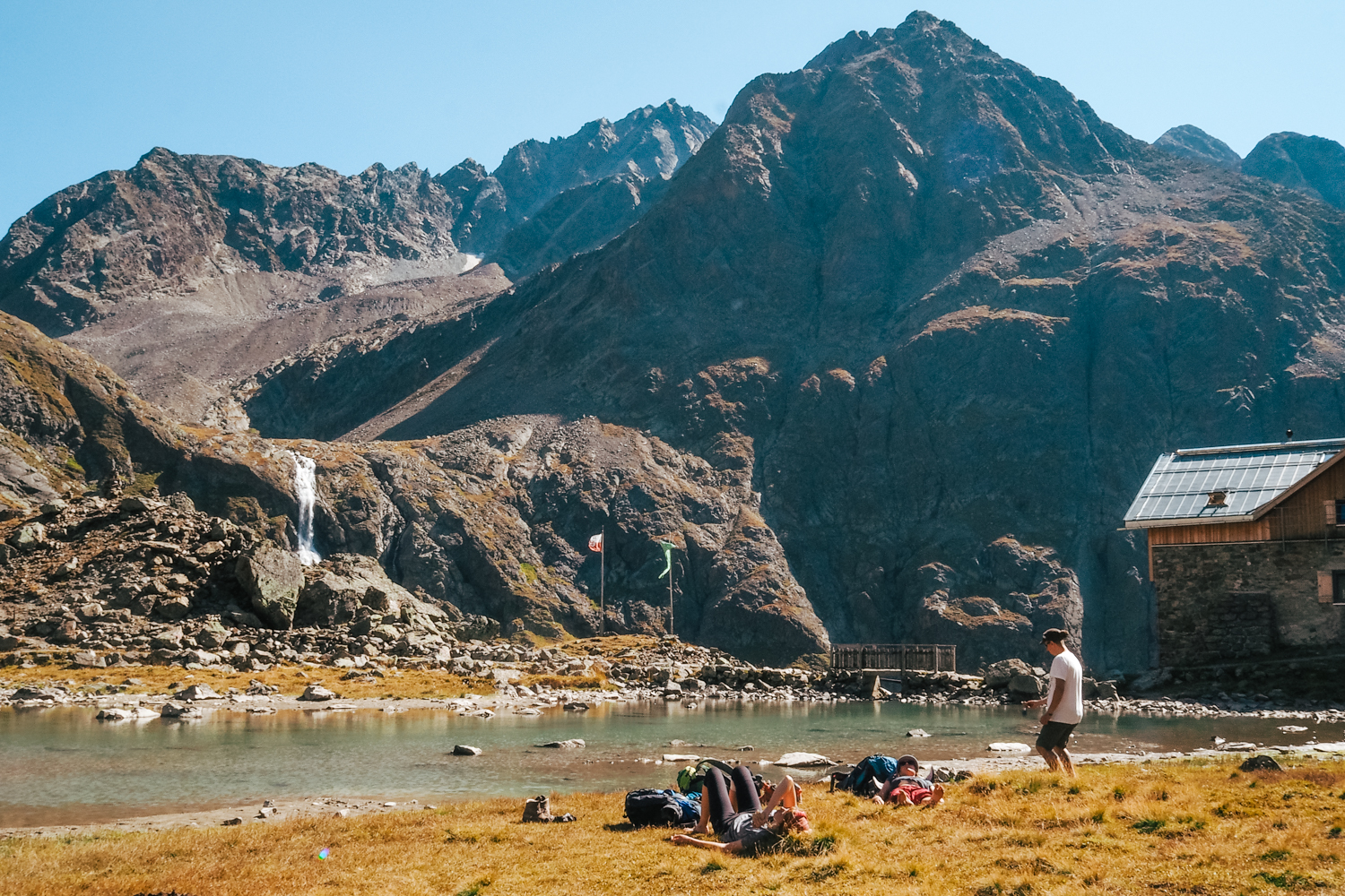 Der Abstieg gestaltete sich sehr steil und war nur mit besonderer Vorsicht zu meistern. Die Winnebachseehütte rückte immer näher und schließlich kamen wir am frühen Nachmittag am Winnebachsee (2355) an. Der See eignet sich perfekt, um mit den Füßen in den eiskalten Bergsee zu einzutauchen und schließlich im Gras davor ein kleines Nickerchen in der Mittagssonne zu genießen.