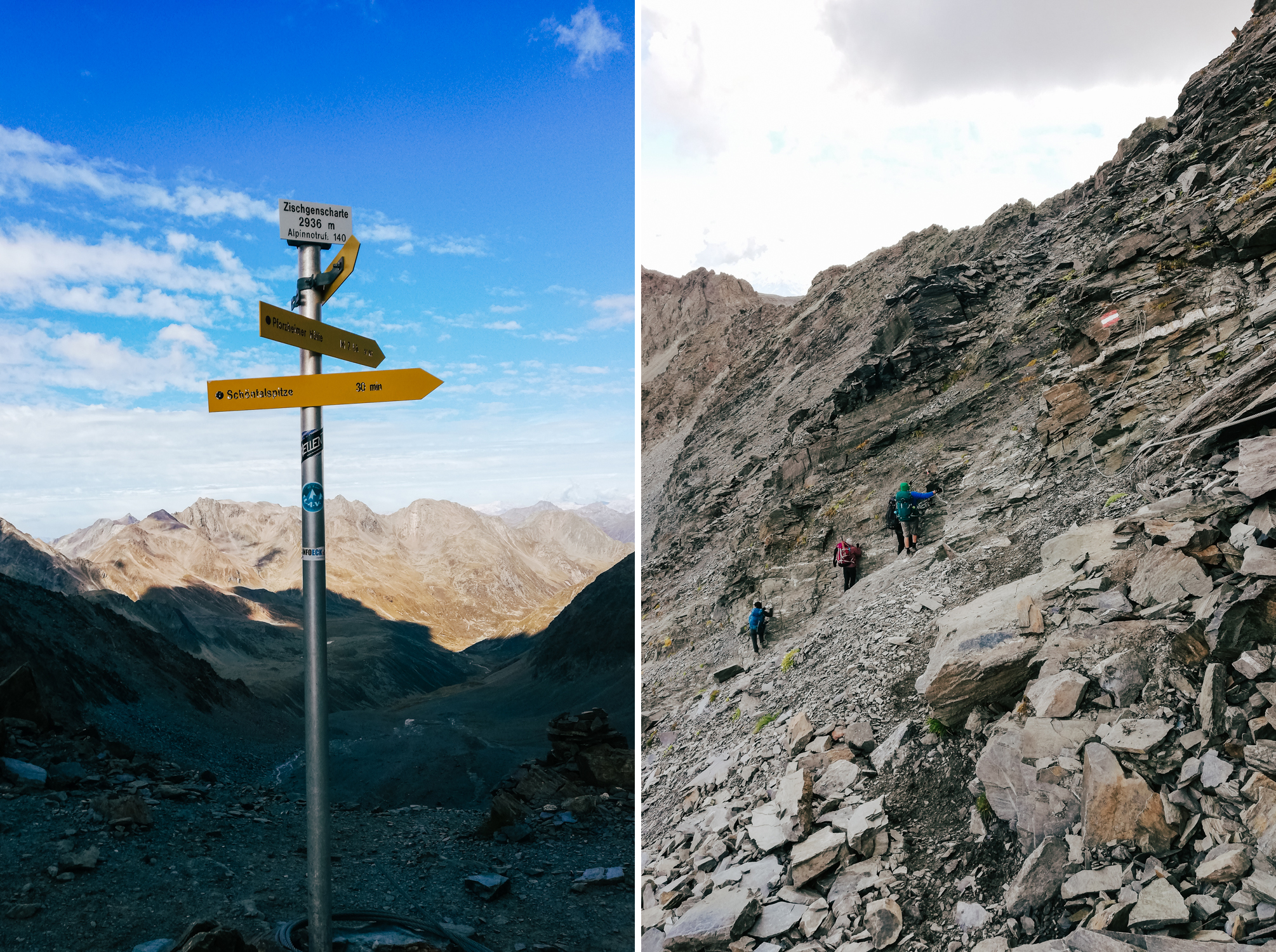Unsere erste Etappe war das Winnebachjoch (2763). Ich quälte mich in den frühen Morgenstunden steil durch das Geröll hinauf. Aber oben angekommen, war alles Leid und alles Fluchen verflogen. Kurze versicherte Stellen machten uns den Abstieg einfach und weiter ging es Richtung Westfalenhaus. Wir nahmen aber eine Abkürzung über die Münsterhöhe (2471), wo wir eine kleine Pause einlegten. Schon von hier aus konnten wir die Zischgenscharte (2893) erkennen und ich glaubte meinen Augen nicht. „Hier sollen wir rauf? Wie soll das überhaupt möglich sein?“ Es sah enorm steil aus.