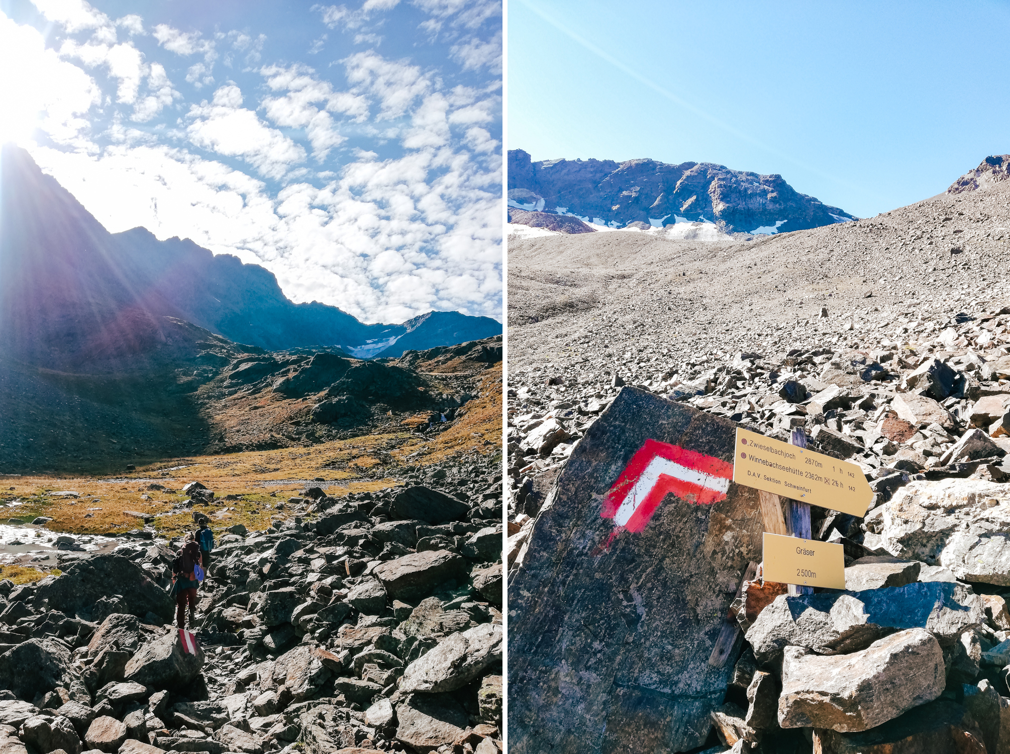 Wir folgten anfangs dem Tal an einem Fluss entlang Richtung Süden. Der Weg führt dann wieder stetig bergauf zum Zwieselbachjoch (2840) . Vor allem hier ist Trittsicherheit gefragt, nicht alle Steine sind fest im Boden verankert.