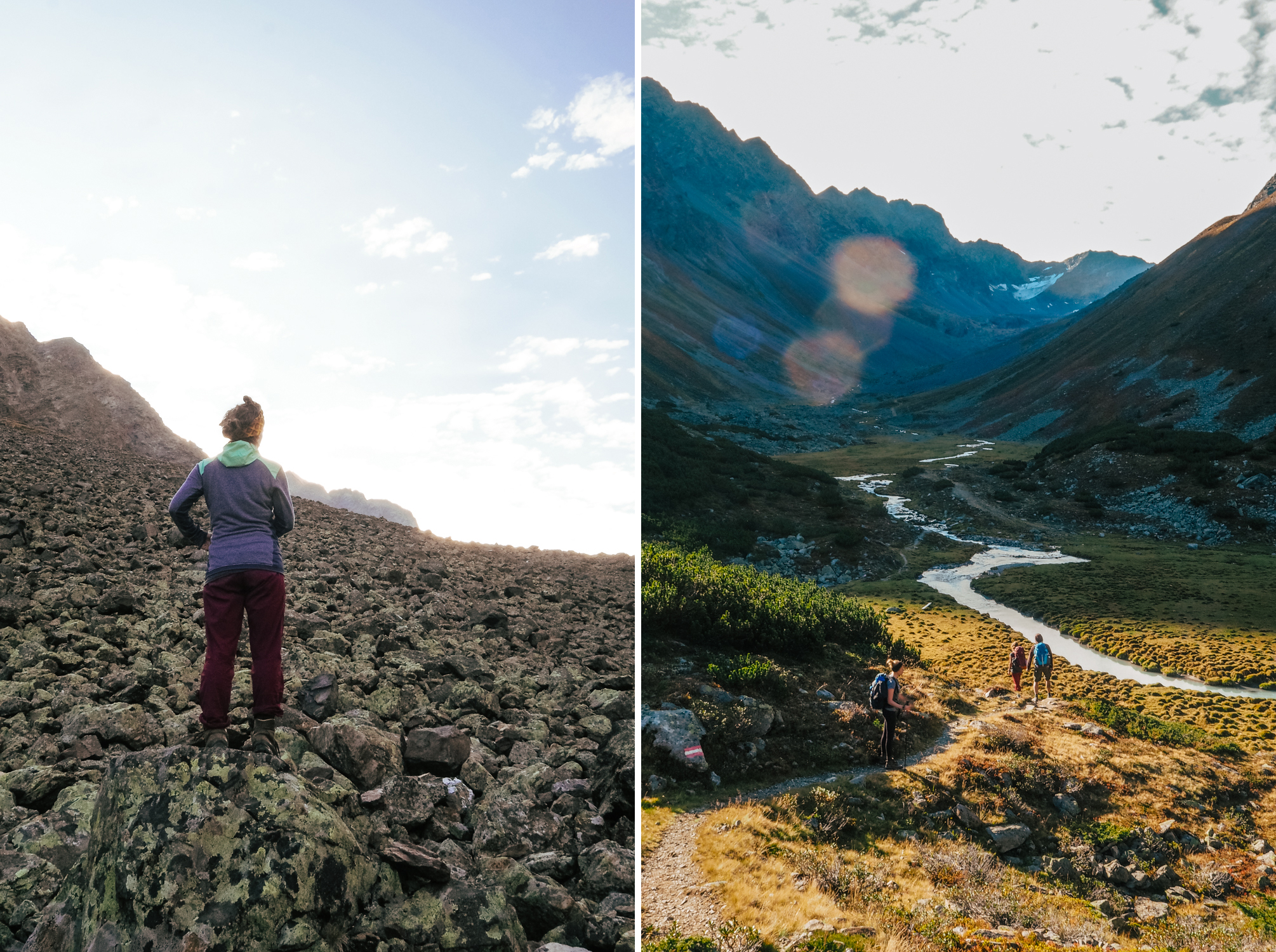 Der zweite Tag war um einiges gemütlicher als der erste. Nach einem ausgiebigen Käsebrot Frühstück starteten wir um 9 Uhr unsere Wanderung. Zu erst noch im Schatten der großen Gipfel rund um uns herum, kamen wir spätestens nach einer Stunde in die kräftige Sonne. Also wieder: eincremen, Hose abzippen, Pullover ausziehen.