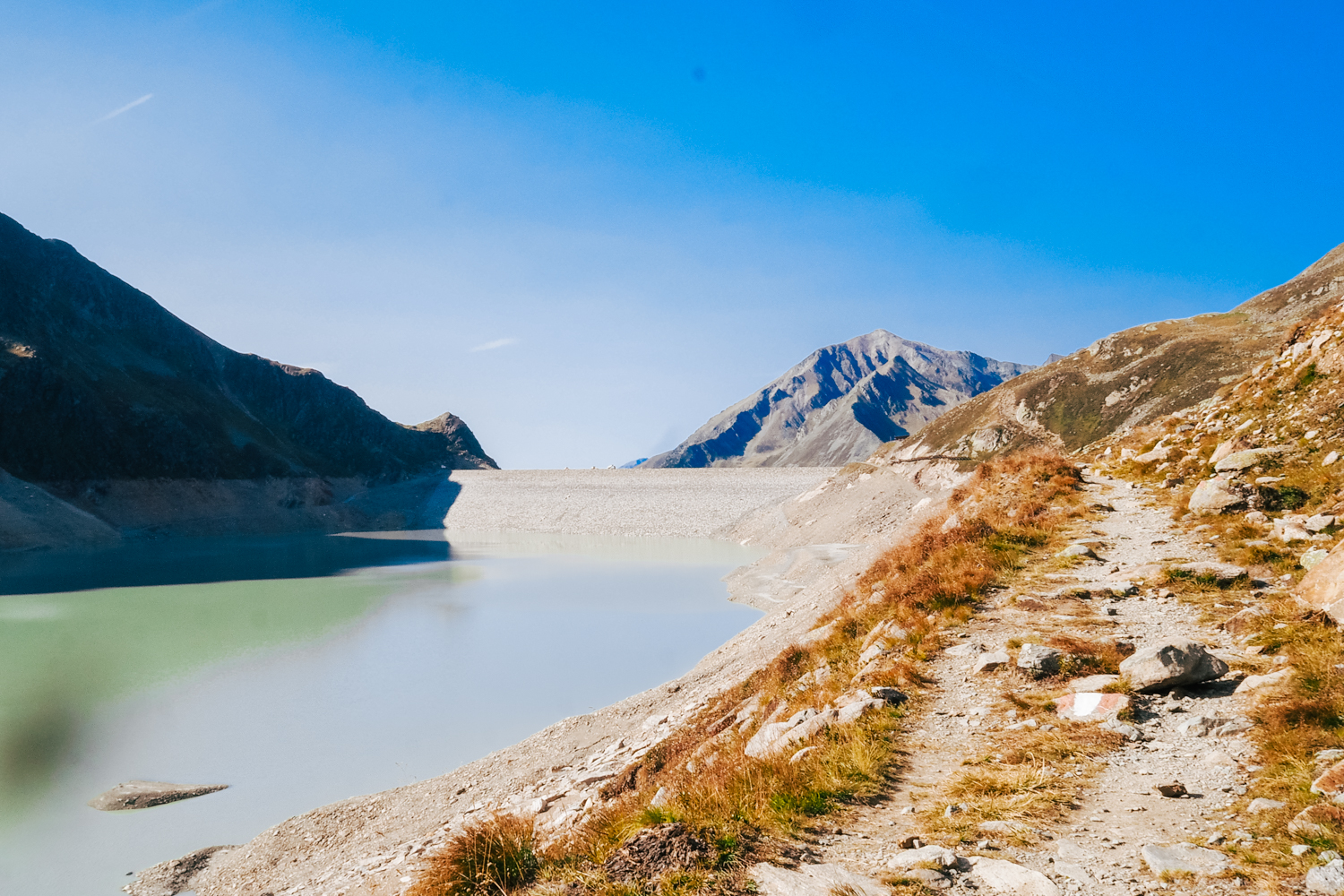Von Kühtai (1949) geht es hinauf zum Finstertaler Stausee. Statt dort wie geplant entlang zu gehen, mussten wir wegen Bauarbeiten noch eine kleinen Umweg machen, schließlich aber ging es stetig hinauf an einem Bach entlang über Geröll zur Finstertaler Scharte (2780) .