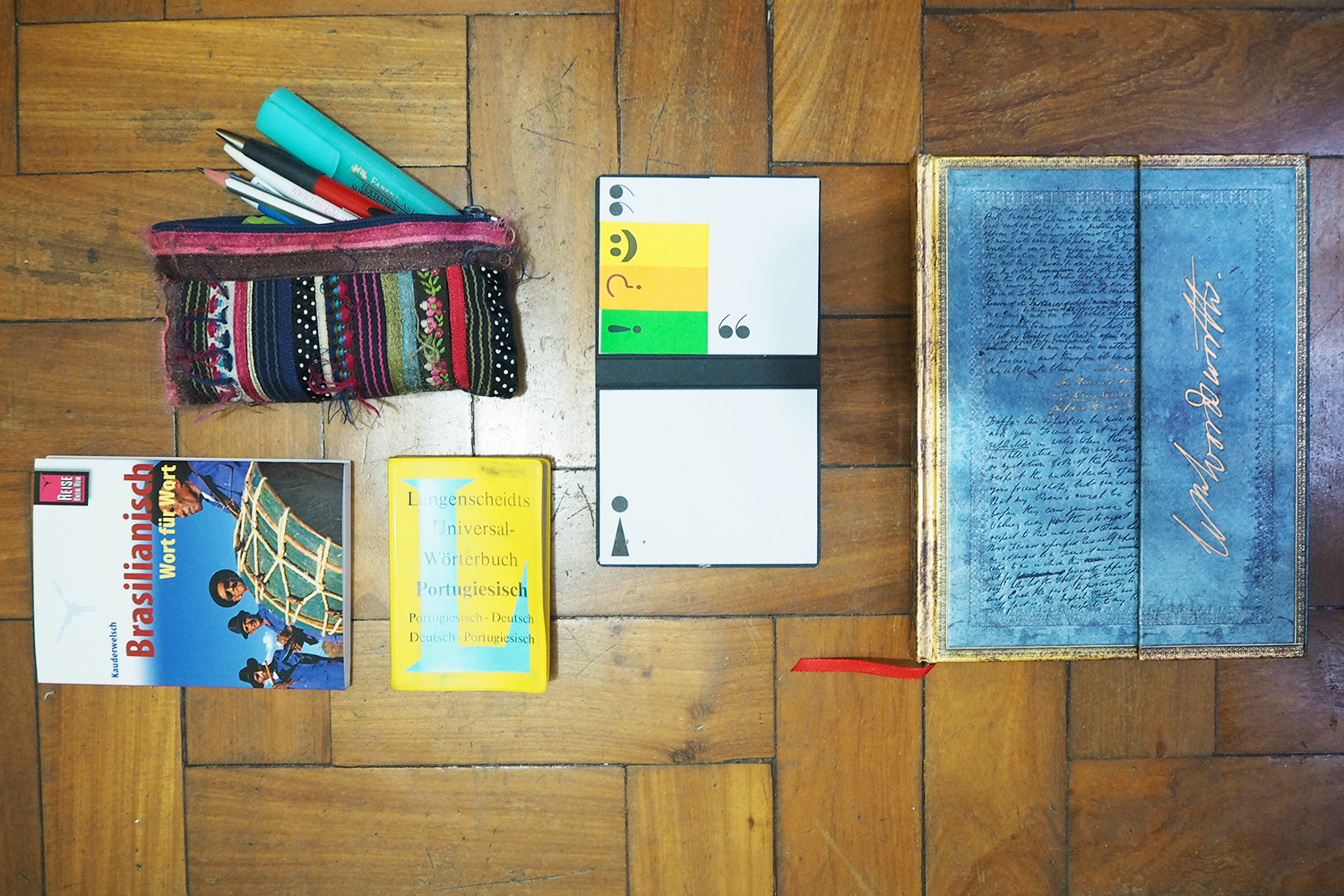 Neben einem ordentlichen Laptop brauche ich auf der Uni auf jeden Fall ein paar essentielle Schreibsachen. Vor allem hier in Brasilien ist es nicht üblich, den Laptop mit an die Uni zu nehmen. Ich nehme an, weil man Angst hat, dass er am Weg zur Uni gestohlen wird. Ich bin ohnehin eine analoge Mitschreiberin, also habe ich mein wunderschönes Paperplaks Buch dabei, dass ich als Geschenk noch vor meiner Reise bekommen habe. Ein paar Stifte sind natürlich auch dabei, vor allem wichtig: Bleistift, Radiergummi, Fineliner, ein Haufen Kugelschreiber und Marker. Zum Portugiesisch lernen, sind dann noch zwei Wörterbücher mit gekommen.