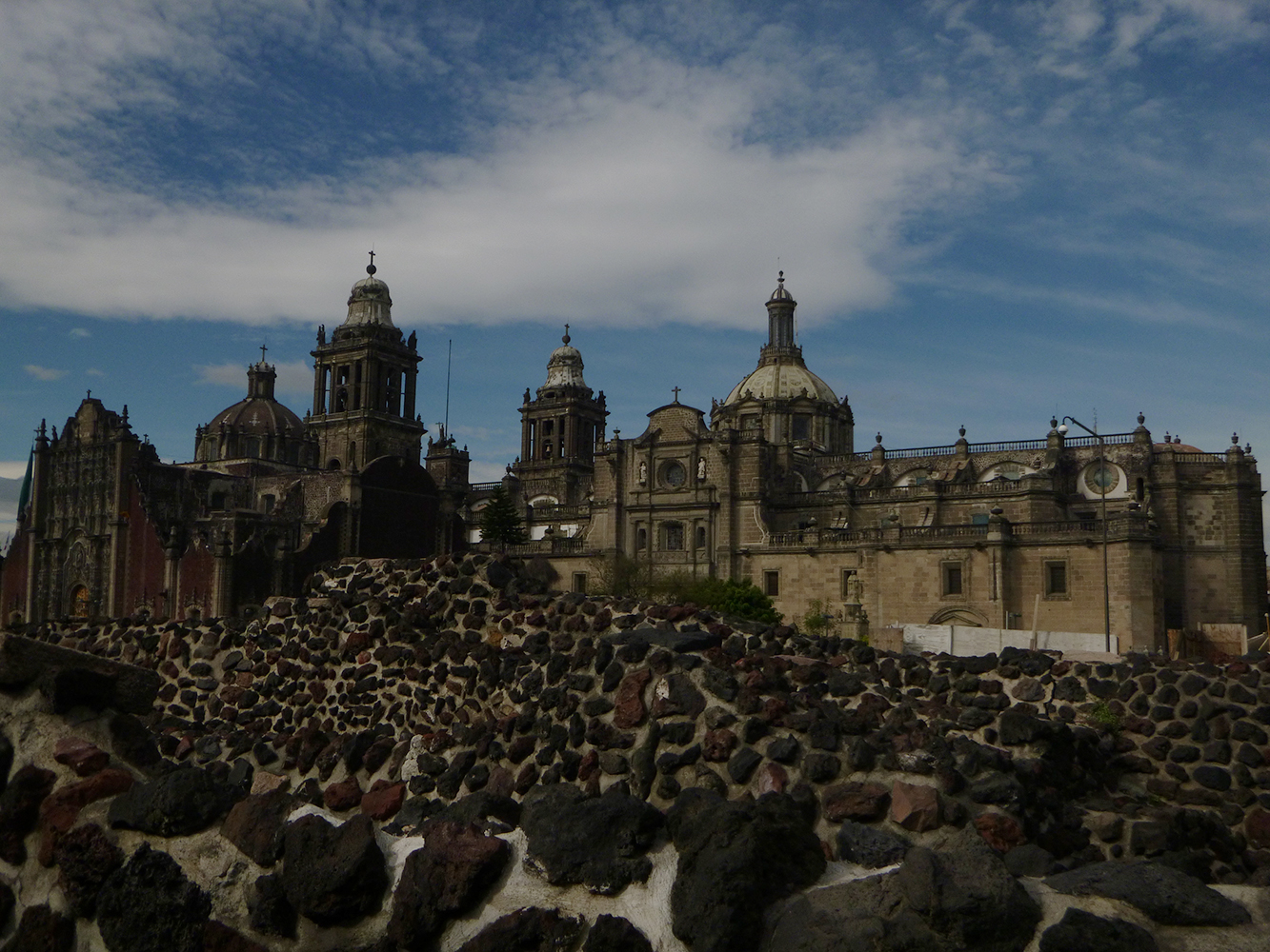 Durch Zufall haben wir an unserem letzten Tag auch noch den Templo Mayor (großen Tempel) besichtigt. Was viele nicht wissen ist, dass Mexico City direkt von den Spaniern auf die Aztekenstadt Tenochtitlan gebaut wurde. Dort wo ihr größter Tempel stand errichteten die Conquistadores ihre Kathedrale, um alle Menschen die dort lebten der katholischen Kirche zu unterwerfen. Tenochtitlán war bereits in Mitten eines großen Sees als schwimmende Stadt, wie in Venedig auf Holzstützen gebaut worden. Seit Mexikos Hauptstadt darüber gebaut wurde sinkt die Stadt an vielen Stellen und manche Gebäude stehen schon lange nicht mehr in ihrem Gleichgewicht. Erst Ende der 70er Jahre haben Forscher angefangen Mitten in der Stadt Gebäude abzureißen und zu graben, mit Erfolg. Direkt neben der Kathedrale fanden sie einen der Haupttempel der Aztekenstadt mit jahrhundertalten Schätzen. Ein ausführliches Museum zu der Ausgrabung befindet sich direkt im Anschluss an der Ausgrabungsbesichtigung. Die Vorstellung was man noch alles unter dieser Kolonialstadt finden würde, finde ich faszinierend.