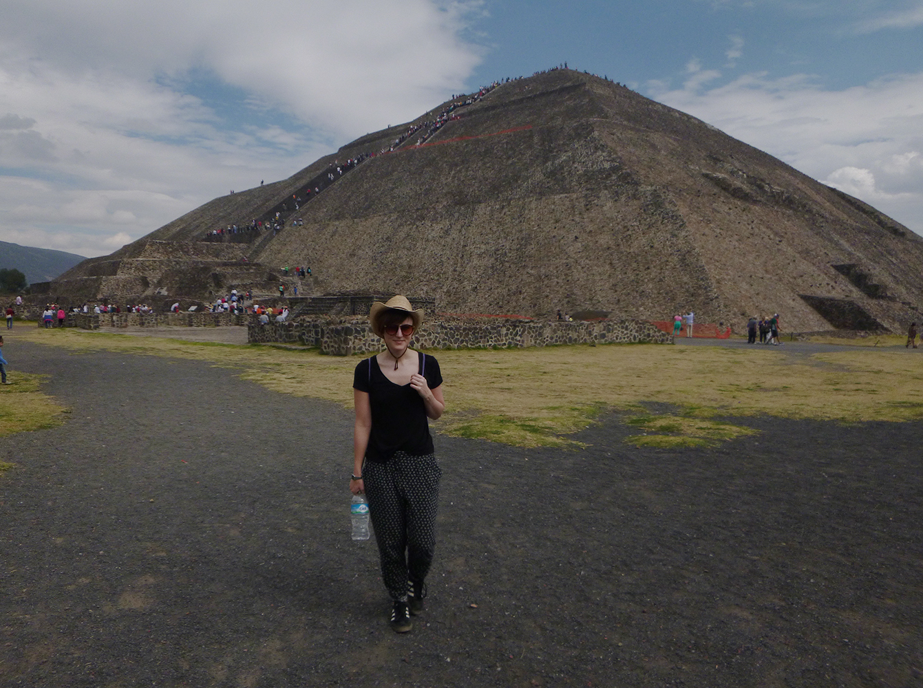 An unseren zweiten Tag in der Millionenmetropole hieß es früh aufstehen, denn ein Jugendtraum sollte für mich in Erfüllung gehen. Seit ich denken kann wollte ich die Pyramiden in Mexiko sehen. Mit 17 Jahren verschlang ich Fachliteratur über die Maya und deren Kalender und seither muss auch jede Doku zu dem Thema geschaut werden. Von Freunden hatten wir den Tipp bekommen uns mit reichlich Essen und Wasser auszustatten, damit wir vor Ort nicht unser ganzen Geld lassen müssen. Den Tipp kann ich nur weiterempfehlen! Wir hatten unser Mittagessen in Form eines Brotes dabei und sparten dadurch einiges an Geld. Die Anreise zu den Pyramiden war relativ einfach. Am Busbahnhof Oriente fährt ein kleines Busunternehmen stündlich in die abgelegene prähistorische Ruinenstadt. Die Fahrt dauert eine Stunde und wenn man Glück hat bekommt man auch einen Sitzplatz. Unbedingt Sonnencreme und Hut mitnehmen. Die Sonneneinstrahlung ist auf Grund der Höhe von ca. 2200 Meter extrem stark. Verbracht haben wir dort wirklich fast den ganzen Tag, wir waren auch wirklich beeindruckt von den tollen Bauten. Die Sonnen und Mondpyramide waren einer der großen Highlights meiner Reise.