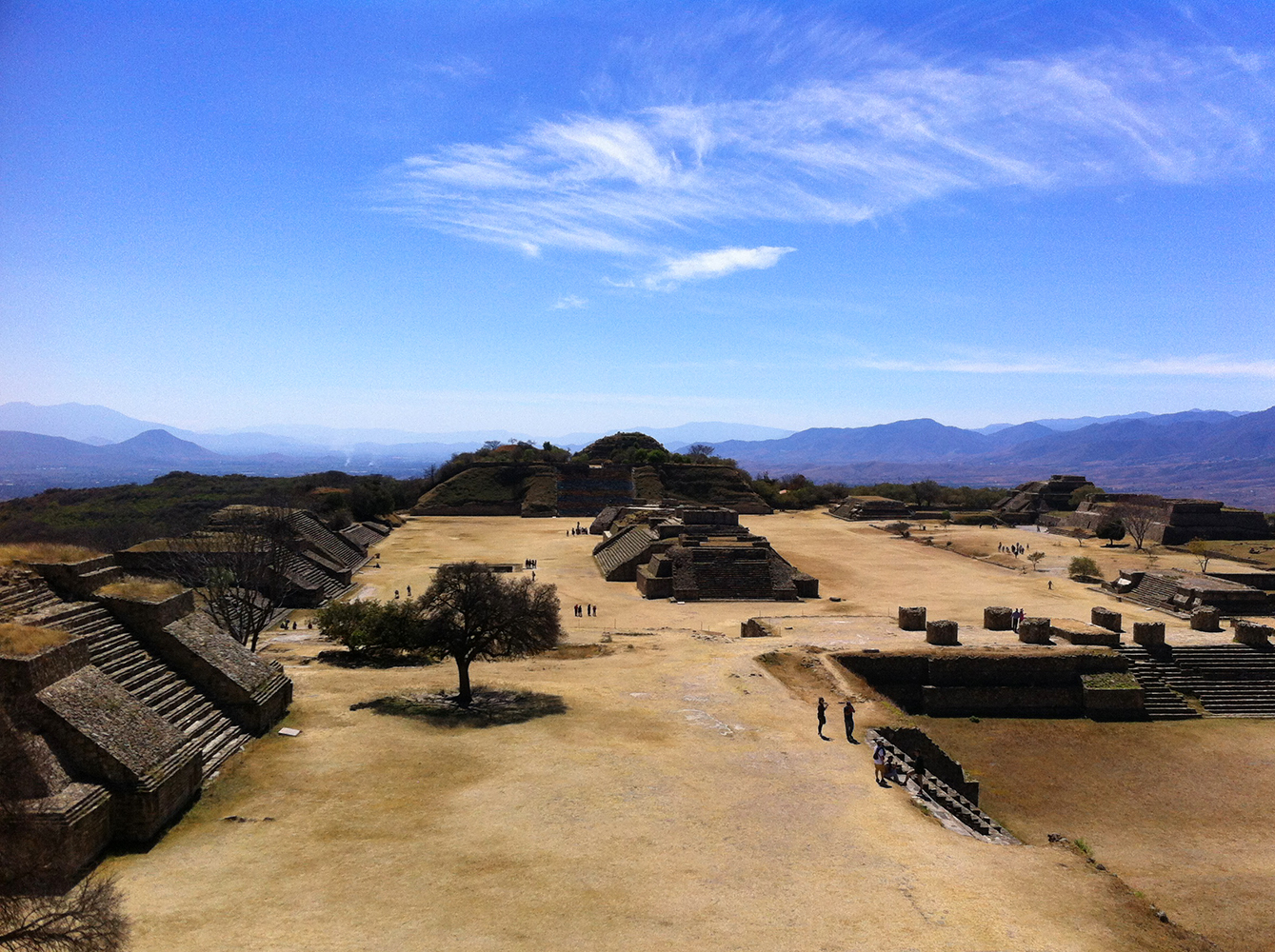 Der Monte Albán ist ein Berg 10 km von Oaxaca entfernt, dort haben vor mehr als 1000 Jahren die Zapoteken ihre Hauptstadt erbaut. Heute ist es eine riesige Ausgrabungsstätte mit vielen Pyramiden (die leider nicht mehr ganz so gut erhalten sind) und Tempelanlagen. Unser Plan wäre es gewesen die Strecke dort hin zu Fuß zu meistern, jetzt bin ich froh, dass uns damals davon abgeraten wurde, denn der Weg dort hin ist weit, steil und unerträglich heiß, noch dazu gibt es keinen Wanderweg und du musst ununterbrochen an der Hauptstraße entlang gehen. Wir entschieden uns also bei einer Tour mit zumachen, die vom Hostel organisiert wurde. Um 10 Uhr morgens wurden wir direkt vor dem Hostel abgeholt und fuhren hinauf auf den Berg, wo wir eine sehr ausführliche und interessante Führung bekamen. Später hatten wir noch Zeit das Gelände für uns selbst zu entdecken und schließlich ging es gegen 14 Uhr wieder zurück zum Hostel. Auch wenn Monte Albán nicht die beeindruckenste von allen Ausgrabungen in Mexiko ist, sollte man den Weg dort hin nicht meiden, wenn man schon mal in der Nähe ist. Die Größe und Vegetation und vor allem das beachtliche Alter lässt einen dann doch ganz schön staunen.