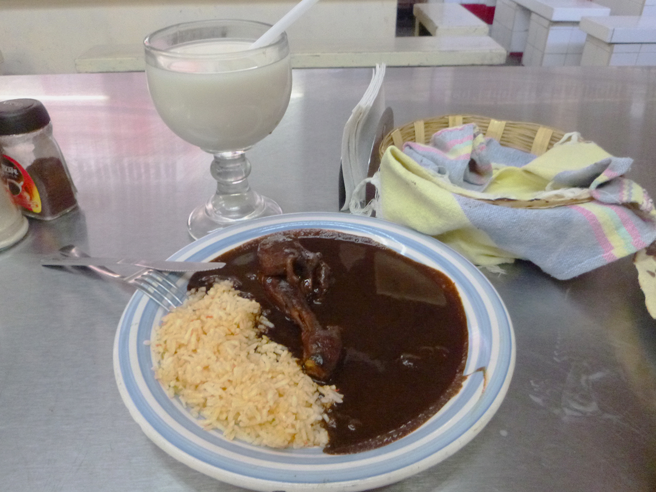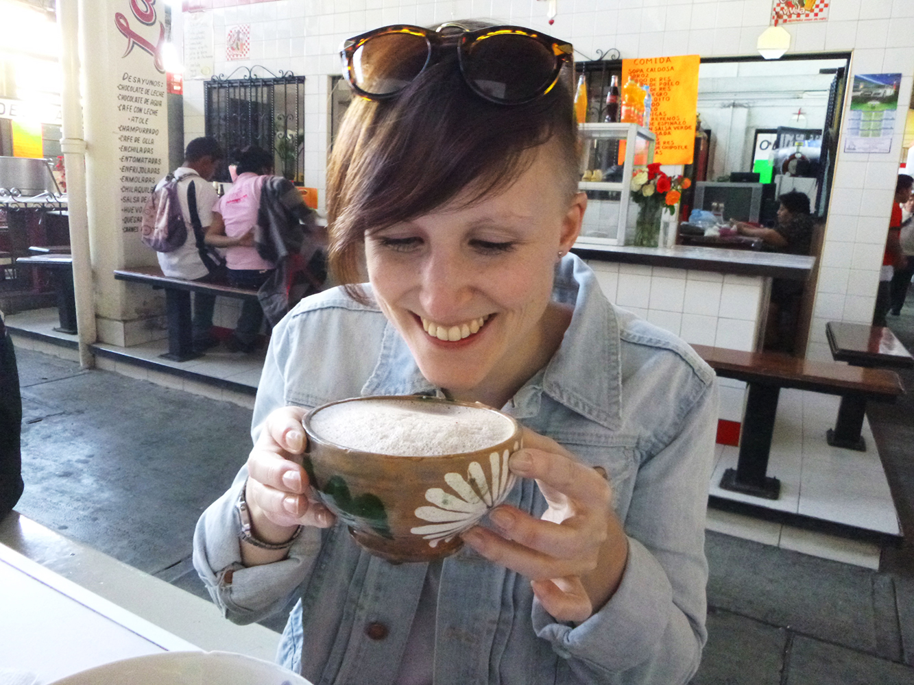 Nein, der Mercado 20 de Noviembre ist keine moderne Shoppingmall, sondern eine alte Markthalle in die ich mich Kopf bis Fuß verliebt habe. Mein Freund hat mir schon ganz schön leid getan, weil ich immer wieder dort hin zurück wollte. Betritt man die Markthalle durch den Foodcorner, durchquert man einen engen Gang in dem nur Fleisch auf heißen Kohlen gerillt wird. Überall dampft es, Leute drängen sich durch und schreien herum, irgendwo bellt ein Hund und du musst nur vorsichtig sein, dass du nicht von einer Seite mit heißem Fett angespritzt wirst. Hat man diesen Weg überstanden geht es weiter in eine große Halle wo sich kleine Küchen mit Sitzgelegenheiten befinden. Überall gibt es das gleiche und doch immer etwas anderes. Da es an unseren ersten Tag bereits zu spät fürs Essen war, versuchten wir am zweiten Tag unser Glück und setzten uns zu irgendeiner Küche dazu. Nach Empfehlung der Köchin bestellte mein Freund Tlayuda (vegetarisch) eine Art Pizza aus Maismehl mit Bohnenpaste, Avokado, Tomate, Zwiebel und Käse. Und ich bestellte mir Huhn mit Mole, eine Sauce aus Nüssen, Bohnen und weiteren Zutaten die über mehrere Stunden gekocht wird. Dazu gab es gesüßte Reismilch, offenbar ziemlich beliebt in Mexiko, man sieht sie einfach überall. Und weil es nach so einem köstlichen Mahl auch immer nach einer Nachspeise verlangt holte ich mir noch eine heiße Schokolade. Ich bekam sogar eine Semmel dazu, die war leider überflüssig, da mein Magen schon bis obenhin voll war. Weiter ging es zum gegenüberliegenden Gebäude, in den Bereich wo Kleidung, Schuhe, Hüte, Taschen und alles erdenklich andere verkauft wird. Ich war im Himmel und dennoch beging ich den Fehler, dass ich nicht alles kaufte, was ich haben wollte. Glaubt mir, eine bessere Gelegenheit als in Oaxaca habt ihr nie mehr! Viele Sachen sind in den anderen Städten entweder und vieles teurer oder gar nicht vorhanden. So trauerte ich den Rest meiner Reise wunderschönen Sandalen hinterher, die es dort en masse gab und ich in den anderen Städten nie wieder sah. Übrigens habt ihr genau dort auch die Gelegenheit frittierte Heuschrecken und Mezcal (Schnaps aus grüner Agave) zu probieren. Glaubt mir, dieses Erlebnis werdet ihr nie bereuen!