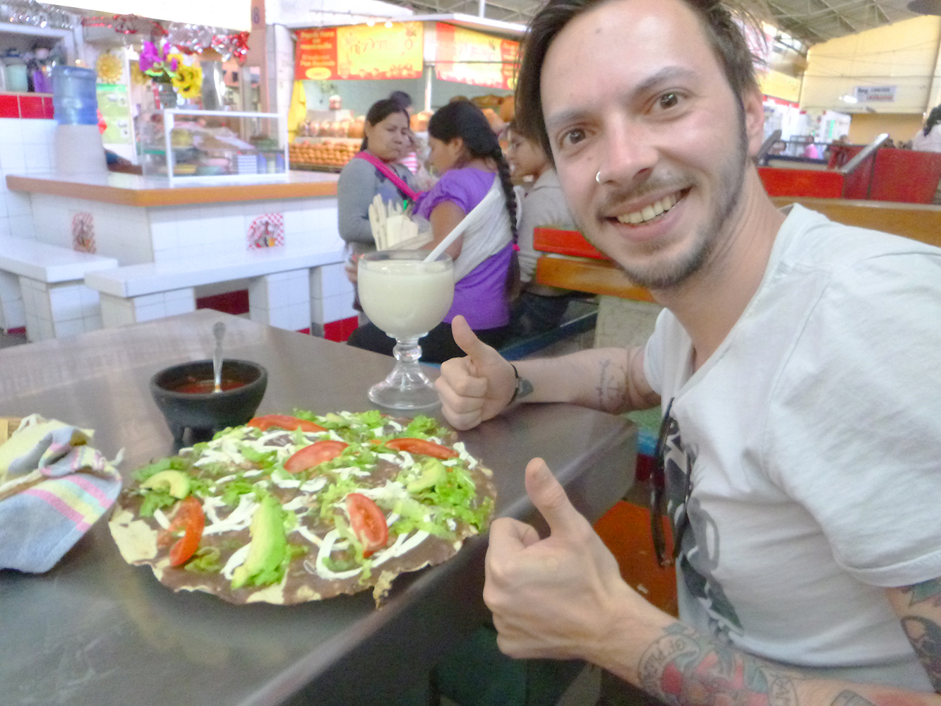 Am ersten Abend ging es für uns gleich mal in ein vegetarisches Restaurant namens La Zanahoria (5 Oriente 206) das uns nicht nur vom Lonely Planet, sondern auch von unseren Freunden empfohlen wurde. Wir waren so was von Begeistert von dem Laden. für gerade mal 60 Pesos gab es ein riesen großes Buffet mit mexikanischen vegetarischen Spezialitäten. Dazu konnte man so viel Agavensaft trinken wie man mochte. Damit konnte ich wirklich nicht aufhören. Neben gefüllten Kaktus gab es allerhand anderes Gemüse und Fleischersatz in allen Variationen. Ich dachte einmal sogar, dass ich Hühnerfleisch erwischt hatte und wollte meinen Freund schon vorwarnen, bis er mich beruhigte und meinte es sei Tempeh. Alle Daumen hoch für dieses tolle Buffet! Am zweiten Tag probierten wir typisch mexikanisches Streetfood, über das wir uns bis dahin nicht drüber getraut haben. Mit dem Tipp vom Lonely Planet fanden wir uns in einem sehr kleinen, hektischen Laden Las Ranas (2 Poniente 102) wieder, wo wir aber schnell bedient wurden. Ich bestellte mir eine Torta Gringa. Also ein Brötchen mit würzigem Fleisch und etwas Käse. Einfach unglaublich köstlich, obwohl es so einfach ist. Unsere beiden Abende verbrachten wir im A GO GO (3 Oriente 603), einem hippen Laden im Studentenviertel. Viele Junge (fast zu junge) Leute waren dort anzutreffen und es gab ziemlich feine Cocktails zu guten Preisen.