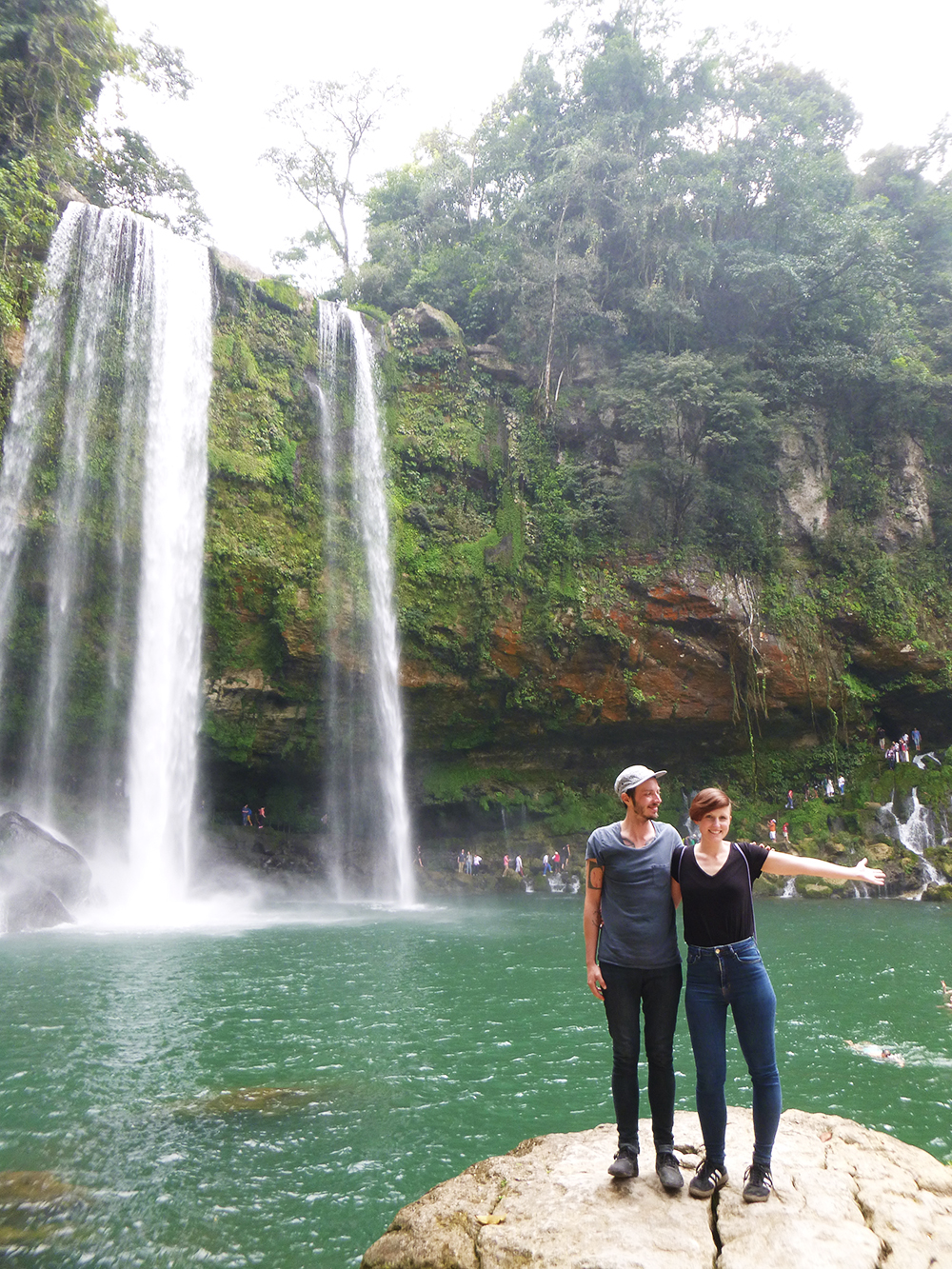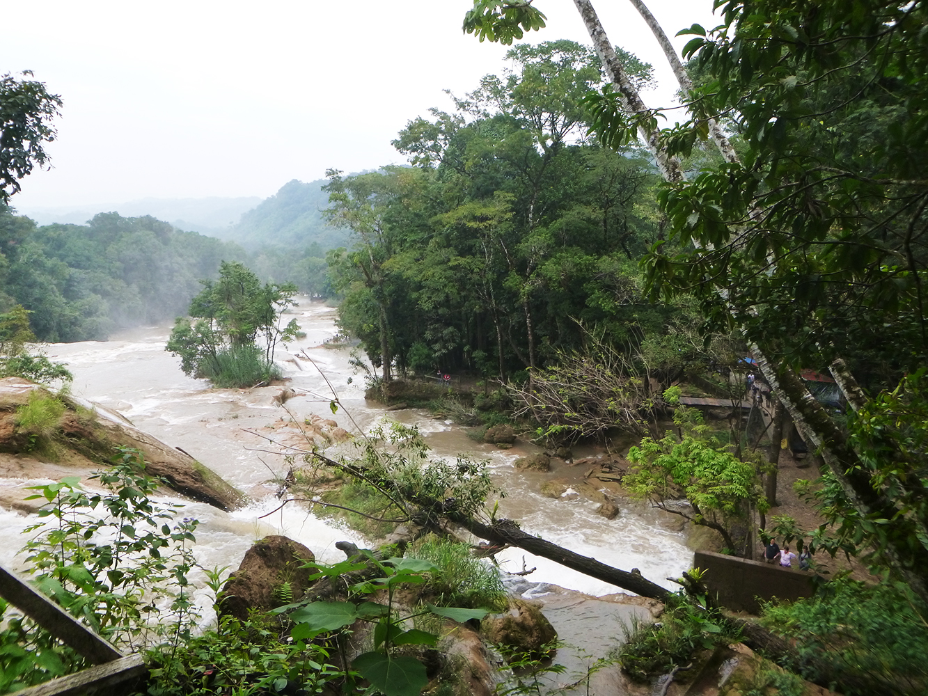 Als uns der Fahrer erklärte, er müsse etwas schneller fahren, damit er mit den anderen Bussen aufschließen konnte, fragten wir ihn warum. Als Antwort gab er uns: „Das ist nur für eure Sicherheit“ und lachte. Etwas später, kurz vor unserem ersten Ziel, blieb er stehen, mitten im Urwald. Frauen standen draußen auf der Straße, waren in traditionellen Kleidern gehüllt und wollten frisches Obst verkaufen. Unser Fahrer wies uns darauf hin, nicht auszusteigen, Fotos machen wäre aber erlaubt. Skeptisch warteten wir ab und versuchten herauszufinden was passiert. Ein Mann kam vorbei und bekam etwas Geld von unserem Fahrer, dann wurden wir weiter gewinkt. Unser Fahrer nannte es „Schutzgeld“. Wir seien jetzt im Gebiet der Zapatista und um Unannehmlichkeiten aus dem Weg zu gehen, muss man bezahlen. Wir fuhren an einem Zeltlager vorbei, wo Männer mit schwarzen Skimasken draußen standen und Schießübungen mit ihren Waffen machten. Es war ein seltsames Bild, trotzdem fühlte ich mich nicht unwohl. Unser Fahrer war scheinbar ein großer Anhänger der Zapatista und schwärmte nur so von ihnen. Er meinte: „Jetzt wisst ihr, dass es sie gibt! Die Medien erzählen immer, dass sie nicht mehr existieren!“.Wir kamen nun endlich bei unserem ersten Stopp, dem Agua Azul an. Bekannt ist dieser Wasserfall wegen seiner türkisblauen Farbe, da es allerdings am Vortag geregnet hatte, handelte es sich eher um einen Agua Marrón, also um ein braunes Wasser. Da ich mit dem Foz do Iguaçu in Brasilien schon relativ verwöhnt war was Wasserfälle betrifft, konnte mich der Agua Azul nur bedingt beeindrucken. Leider war es auch sehr verdreckt von den vielen Touristen, die dort hin pilgerten. Überall lagen leere Wasserflaschen und anderer Müll herum. Wirklich schade um das schöne Plätzchen.Nach ungefähr einer Stunde Aufenthalt ging es weiter zum Misol-Ha. Als wir dort ankamen, war endlich die Sonne draußen und wir sahen sogar Leute, die es wagten im kühlen Nass eine Abkühlung zu nehmen. Für eine Runde Schwimmen hatten wir leider nicht genügend Zeit, also erkundeten wir einfach so den Wasserfall. Die Farbe und die gewaltige Macht des Wassers waren dann doch sehr beeindruckend und stellten den Agua Azul schnell in den Hintergrund.