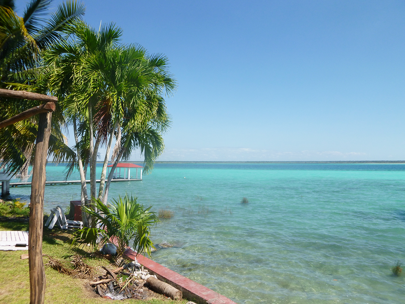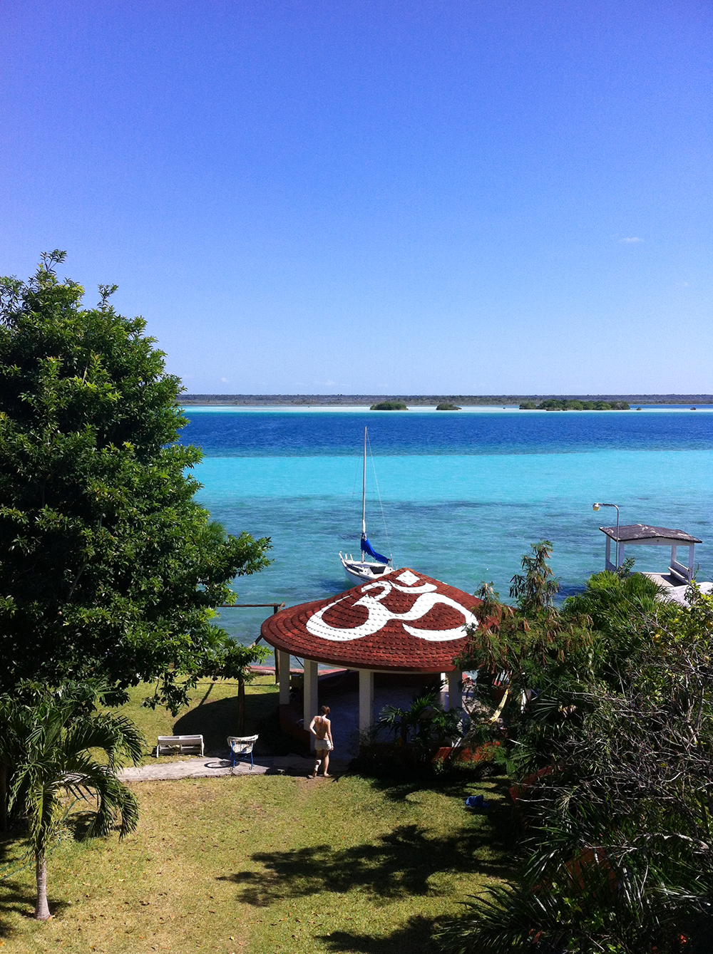 Das Hostel Casa LaHar war etwas eigenartig. Wir hatten es via Hostelworld wegen der guten Bewertungen gebucht. Im Gegensatz zu allen anderen Hostels und Hotels war es auch das einzig leistbare in Bacalar. Man merkte schön langsam, dass wir uns nicht mehr in den armen Regionen Mexikos befanden, sondern mittlerweile im reichsten Staat Quintana Roo angekommen sind. Betrieben wurde das Hostel von einem Hippie Pärchen die den ganzen Tag wilden Techno im Haus hörte und seltsame Hare Krishna Bilder herum hängen hatte. Das 5 Bettenzimmer, das wir gebucht hatten, stellte sich als ein winzig kleines 7 Bettenzimmer heraus, in dem jeden Tag eine weitere Peron hinein gequetscht wurde. Zum Glück waren die anderen Gäste alle super lieb und es gab schon fast ein familiäres Klima zwischen uns. Naja, kein Wunder wenn man sich einen so kleinen Raum miteinander teilt. Die Besitzer schliefen übrigens draußen im Zelt, um mehr Platz für ihre Gäste zu machen. Sehr zuvorkommend von ihnen! Was ich allerdings wirklich hoch loben muss, ist das ausgezeichnete Frühstück mit selbst gemachten Granola, Eiern, Bohnen und Obstsalat. Ein weiterer Pluspunkt war natürlich die Lage direkt am See mit traumhafter Terrasse, auf der früh morgens und abends auch immer Yoga praktiziert wurde.