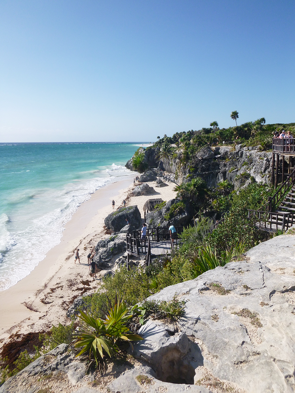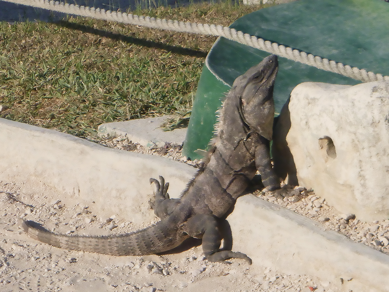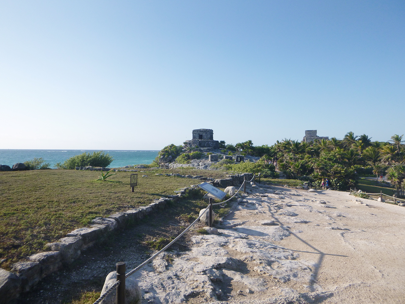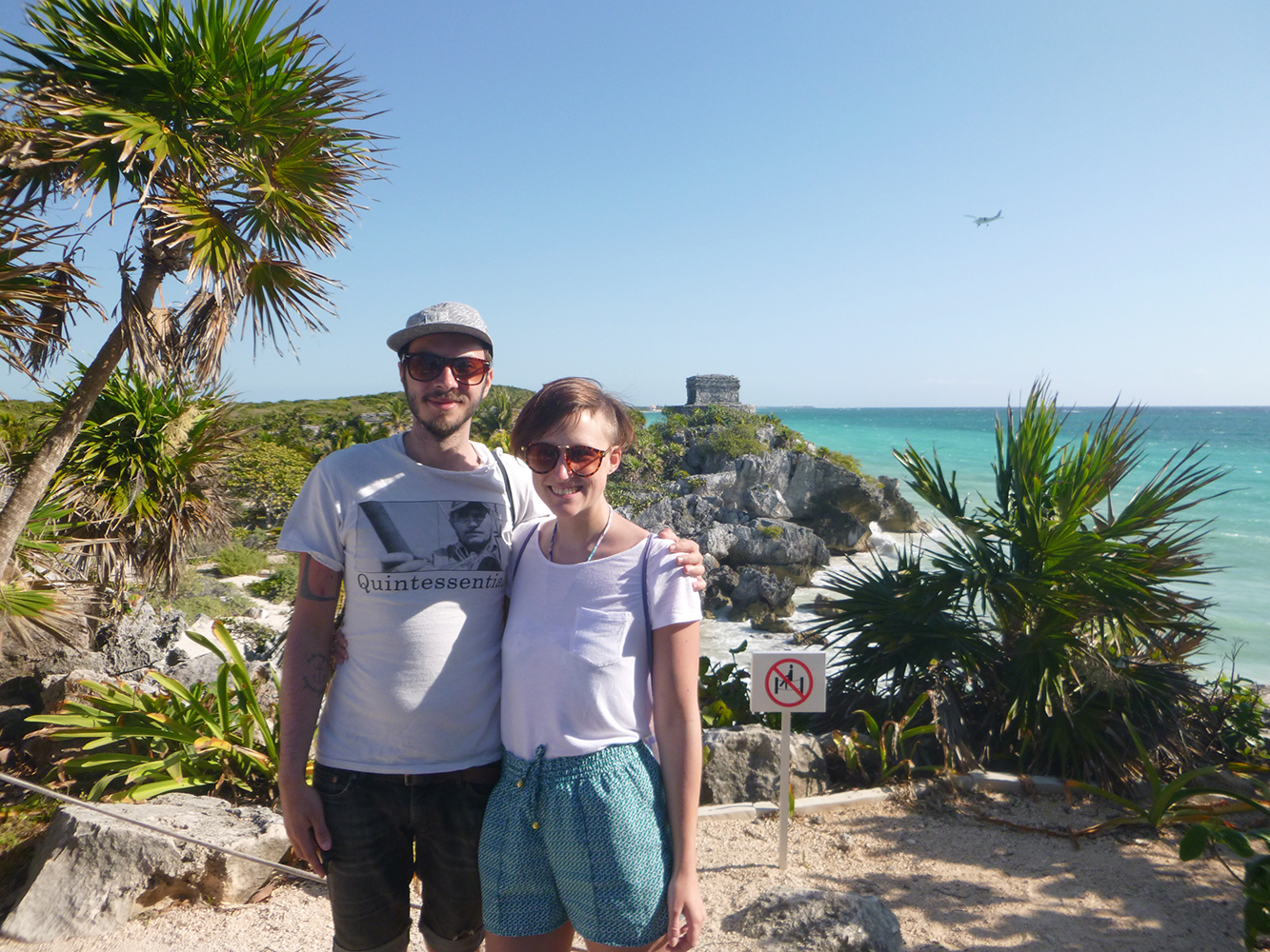 Die Ruinen von TulumNach dem wir an unserem Anreisetag noch entspannten, begann unser nächster Tag zeitlich Früh und wir machten uns bei Sonnenaufgang auf den Weg zu den Ruinen. Alex und ich teilten uns ein Taxi welches uns ungefähr 4€ kostete. Wir lagen gut in der Zeit, nur wenige Touristen kamen auf die gleiche Idee wie wir und waren schon so früh bei der Kassa. Ohne zu warten, konnten wir direkt in den Ausgrabungsbereich hinein gehen. Und ja es war magisch! Die Besucher verteilten sich anfangs noch gut in dem großen Areal, die Hitze war erträglich und die Ruinen einfach unglaublich beeindruckend. Man konnte sich direkt vorstellen, wie Maya vor mehr als 500 Jahren hier noch unentdeckt lebten, mit ihren Schiffen die sichere Anlage verließen und Handel betrieben. Leguane hatten mittlerweile die Ruinen zu ihrem Heim gemacht und schauten uns aus den Fenstern gelangweilt zu und am abgesperrten Schildkrötenstrand konnte man Spuren von Babyschildkröten entdecken. Punkt 11 Uhr war es dann soweit und Massen an Reisegruppen nahmen diesen magischen Ort ein und ruinierten den Zauber. Wir waren zum Glück schon fast durch und näherten uns langsam dem Ausgang.