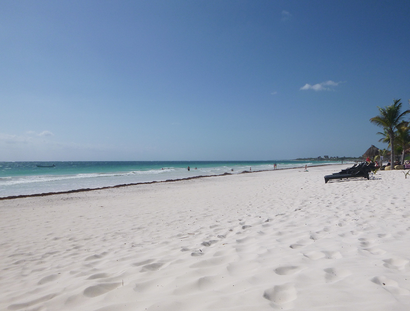 Der Strand von TulumDirekt im Anschluss wollten wir den Strand von Tulum auschecken, soll er doch laut Lonely Planet einer der schönsten Strände in Mexiko sein. Das mag vielleicht auch stimmen, wenn sämtliche Beachbars und Touristen hier einfach nicht existierten würden. Und obwohl hier offensichtlich mal genug Palmen gewesen sind, muss man für Schatten zahlen. Nur wer sich eine Liege in einer Beachbar gönnt kommt auch in den Genuss eines Schattens. Wir taten dies, aber nicht wegen des Schattens sondern viel mehr wegen dem undankbaren Wind, der an diesem Tag herrschte. Das karibische blau des Meeres wurde durch den Wellengang zerstört und der weiße Sand landete in sämtlichen Körperöffnungen und –mulden. Alle anderen Beachbargäste konnten hervorragend entspannen, lasen ihre Bücher, sonnten sich und tranken Cocktails, obwohl ihr komplettes Gesicht mittlerweile in Sand getränkt war. Ich wollte eigentlich nicht aufgeben. Irgendwie musste es ja möglich sein diesen wunderbaren Strand zu genießen. Nach dem ich glaubte nichts mehr hören zu können, weil sich eine dicke Schicht Sand in meinen Ohren befand, beschlossen wir das Projekt Tulum Beach aufzugeben und traten den Heimweg an.