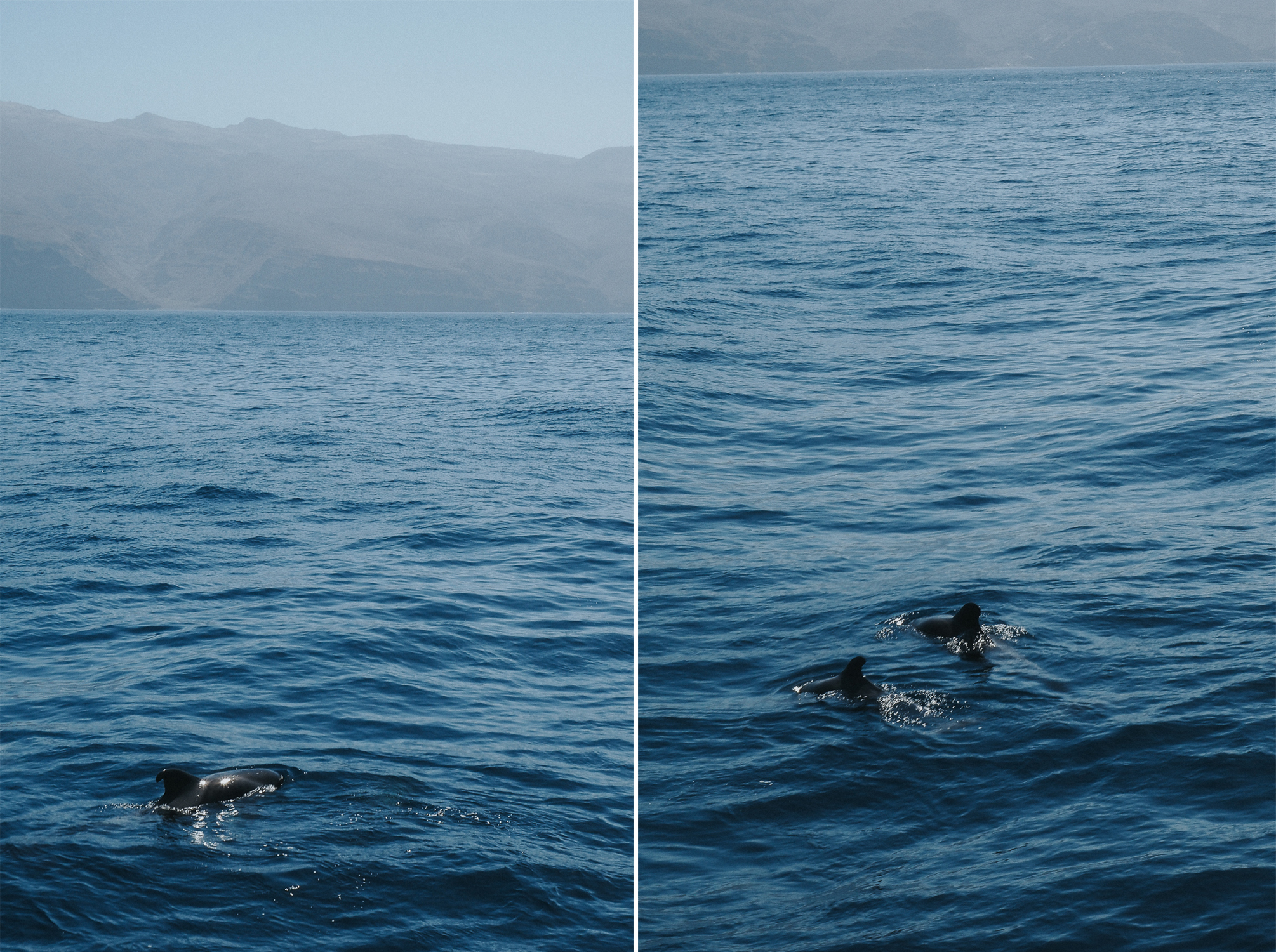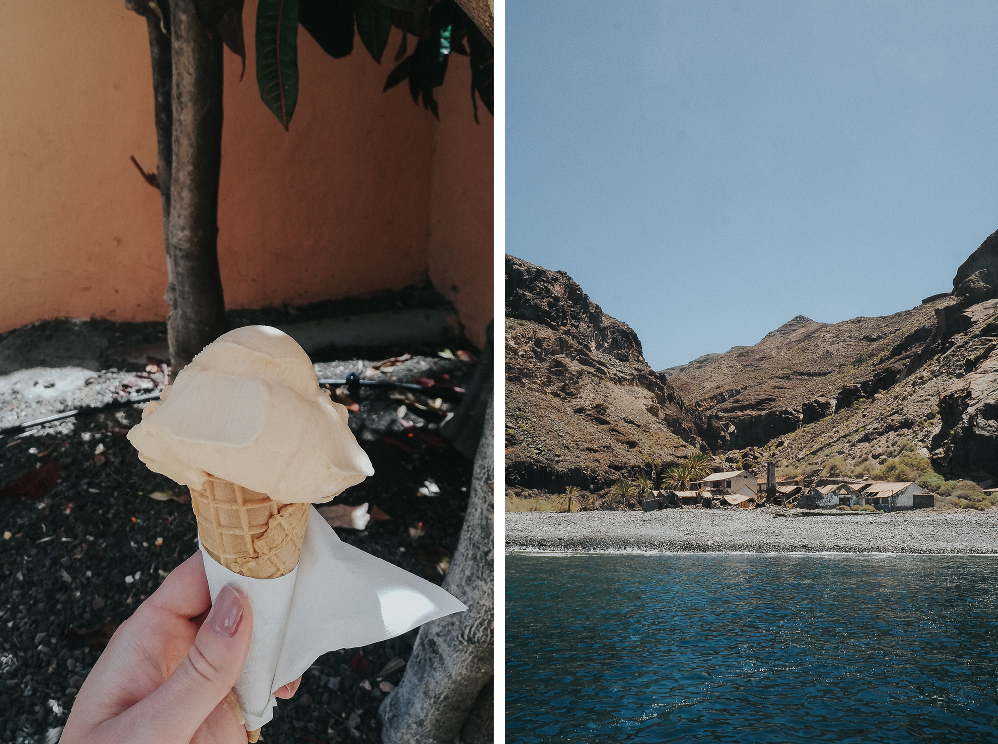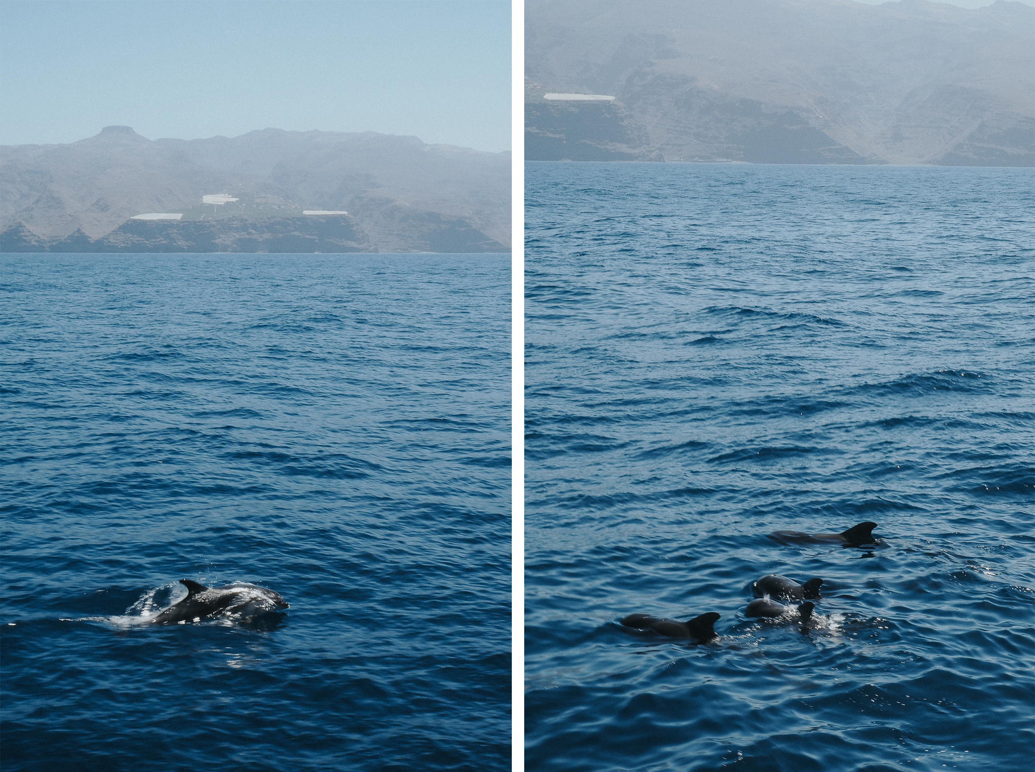 Wir haben zwei Arten Delfine gesehen. Imposant fand ich vor allem die sieben Meter langen Grindwale, die mit ihrem Nachwuchs unterwegs waren. Die dort beheimaten Delfine waren sehr zutraulich und schwammen im gemütlichen Tempo neben uns her. Neben dem Grindwal haben wir auch einige Tümmler Delfine entdeckt. Highlight neben der Delfine Sichtung war auch ein Sprung ins kalte Nass in einer kleinen Bucht, wo das Wasser wunderbar klar war. Anschließend gab’s dann noch ein veganes Maracuja Eis in der Bucht von Valle Gran Rey. Also der perfekte letzte Tag auf La Gomera.