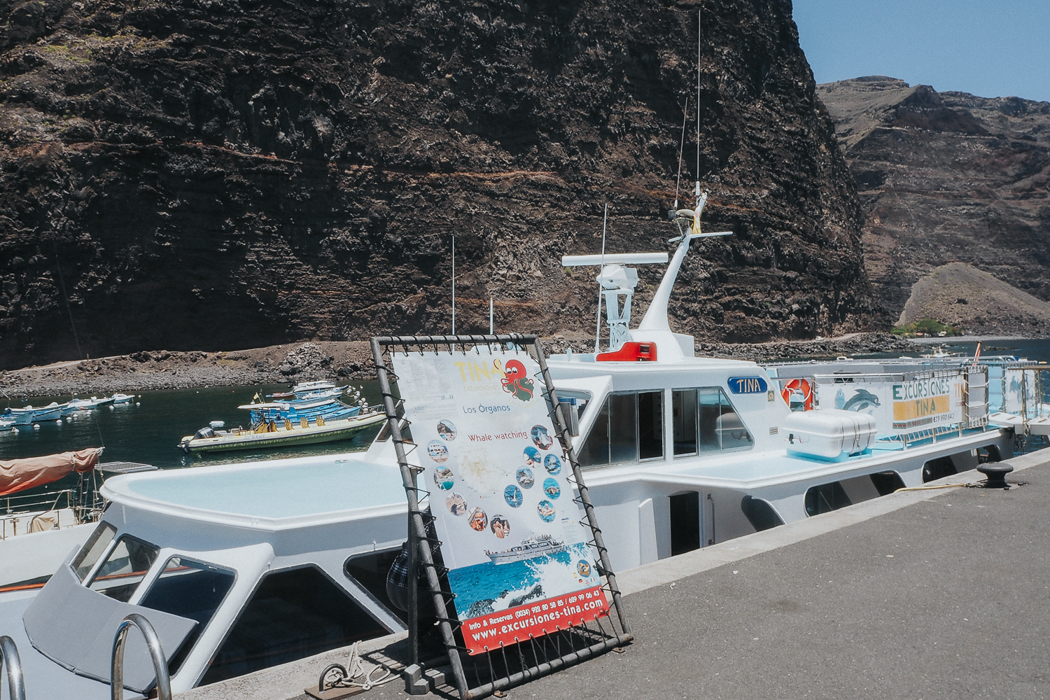 In Valle Gran Rey waren wir vor allem wegen einem Naturspektakel; Delfine beobachten! Ich finde es jedes Mal so wunderschön Tiere, egal welche, in freier Natur zu sehen. Nach meiner ersten Whale Whatching Tour auf den Azoren habe ich definitiv Gefallen daran gefunden und habe mich gefreut auch auf den Kanaren eine solche Exkursion wieder zu machen. In Spanien wird für einen respektvollen Umgang mit Ozean und Tieren die gelbe Flagge verliehen. Wir waren mit Tina Excursiones unterwegs. Auch wieder ein liebevoller Familienbetrieb, die genau diese Flagge auf ihrem Schiff mit sich führt. Bei der Einführung an Board haben wir einiges über die Säugetiere gelernt, aber auch über die Verschmutzung der Meere. Die Aufklärung der Gäste ist meiner Meinung nach ein wichtiger Auftrag einer solchen Agentur. Denn neben dem Beobachten der Tiere, soll es doch vor allem um den Schutz dieser gehen. Auf dem Schiff gab es auch ausreichend Verpflegung. Strohhalme für Kinder gibt’s aus Papier, die Becher sind aus Mais-Stärke und beim Rest handelt es sich um solides Keramik Geschirr und echtes Metallbesteck.