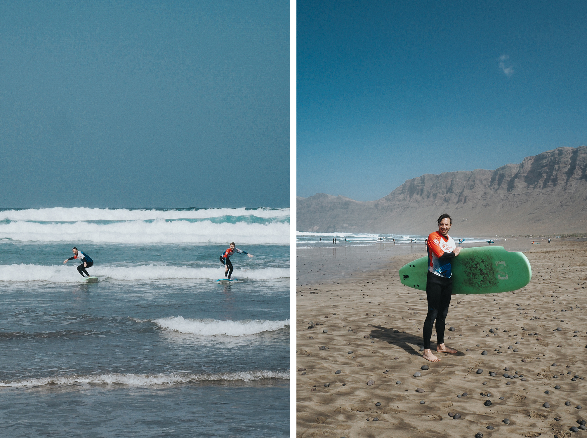 Surfschulen befinden sich auf der ganzen Insel verteilt. Nach langer Recherche haben wir uns dazu entschieden einen Kurs mit Red Star Surf in Caleta de Famara zu buchen. In Famara hat man den Vorteil den Surfstrand direkt vor der Nase zu haben. Drei Kilometer lang bietet er für Fortgeschrittene, Intermediates und Anfänger alle Bedingungen. Trotz der Weite des Strandes, kann es schon manchmal etwas enger werden im Wasser. Allerdings hatten wir auch Tage dabei, wo wir einen ganzen Abschnitt des Strandes nur für uns hatten.