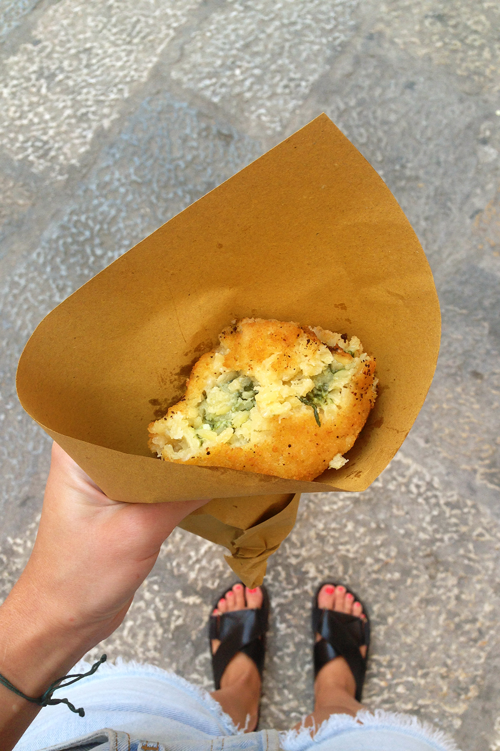Vegan und vegetarisch EssenDie Sizilianische Küche ist geprägt von der arabischen Kultur. Deshalb findet man sehr viele Couscous-, Mandel-, Rosinen- und Pistaziengerichte auf den Speisekarten. Berühmt ist zum Beispiel die Busiate alla Trapanese, bei der die Tomatensauce mit Mandeln verfeinert wird. Generell ein veganes Gericht, leider wird der Nudelteig dort meistens mit Ei gemacht. Also am besten vorher nachfragen. Garantiert vegan ist Caponata, ein Eintopf der an das französische Ratatouille erinnert. Hauptbestandteil sind Tomaten und Melanzani, oft sind dann auch noch Paprika, Sellerie und Oliven darin vorzufinden. Dazu gibt es getoastetes Weißbrot. Den VegetarierInnen unter euch kann ich auf jeden Fall Arancini empfehlen. Das sind frittierte Reisbällchen, bei denen in der Verarbeitung ein Ei und Pecorino untergemischt wird. Gefüllt werden die Kugeln mit Spinat oder Melanzani. Perfekt als Snack für Zwischendurch und auch zum Mitnehmen.