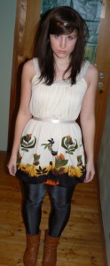 Gestern gings noch einem Geburtstag feiern, da habe ich mir eine ganz besondere Outfitkombination ausgedacht. Und zwar Shine Leggins im 80er Styl und dazu ein Kleidchen im 70er Styl. Fand das ganz witzig so und behielt es an.