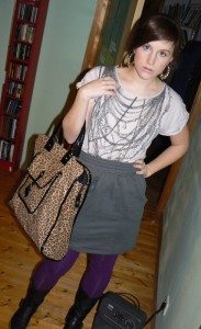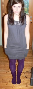 die lila strumpfhosen stehen dir total, vor allem mit der grauen kombi.